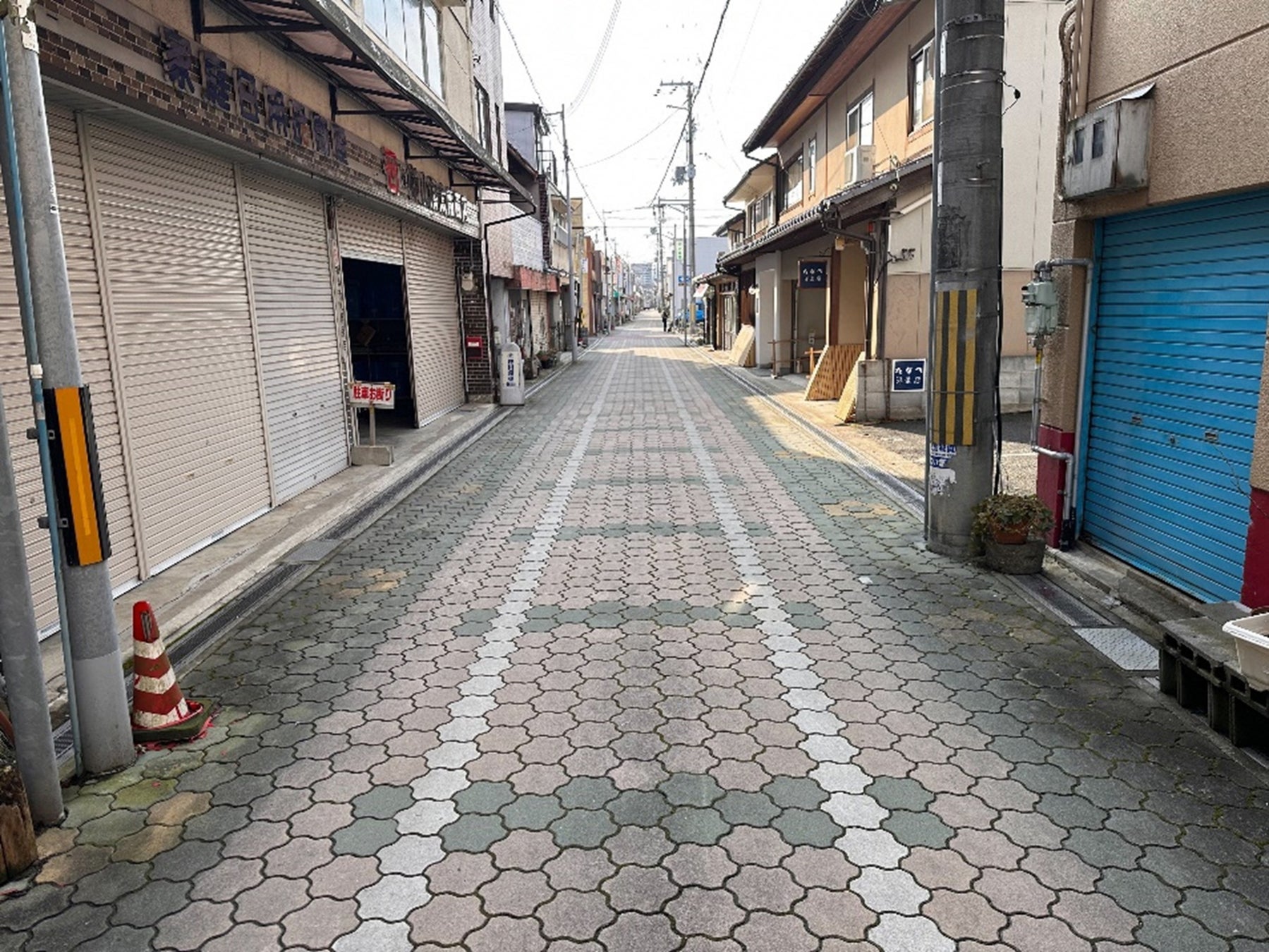 アオイ通り商店街の道路は、線路を模したカラー舗装がされている。