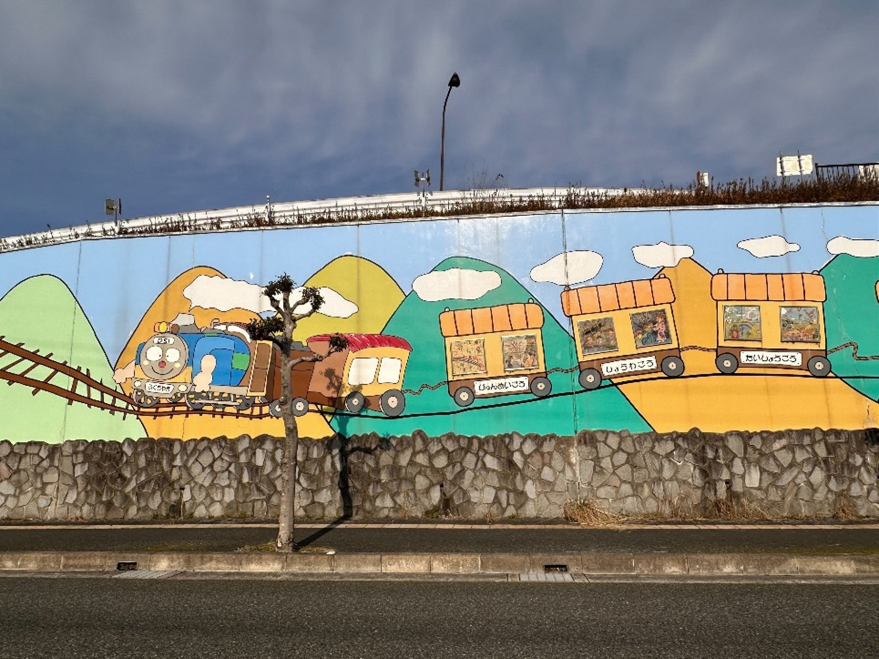音無瀬橋周辺の城下町通りにあるSLをモチーフとした壁画。
