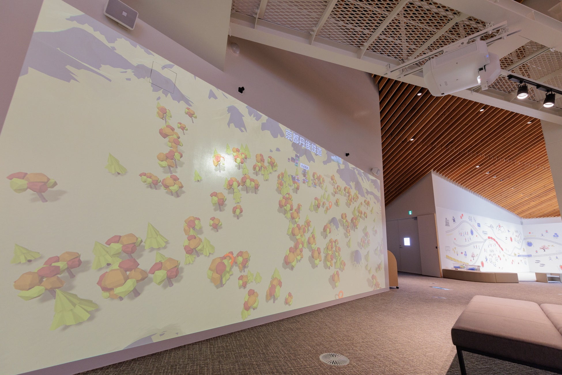 壁一面に広がる画面をタッチして線路やまちをつくれます