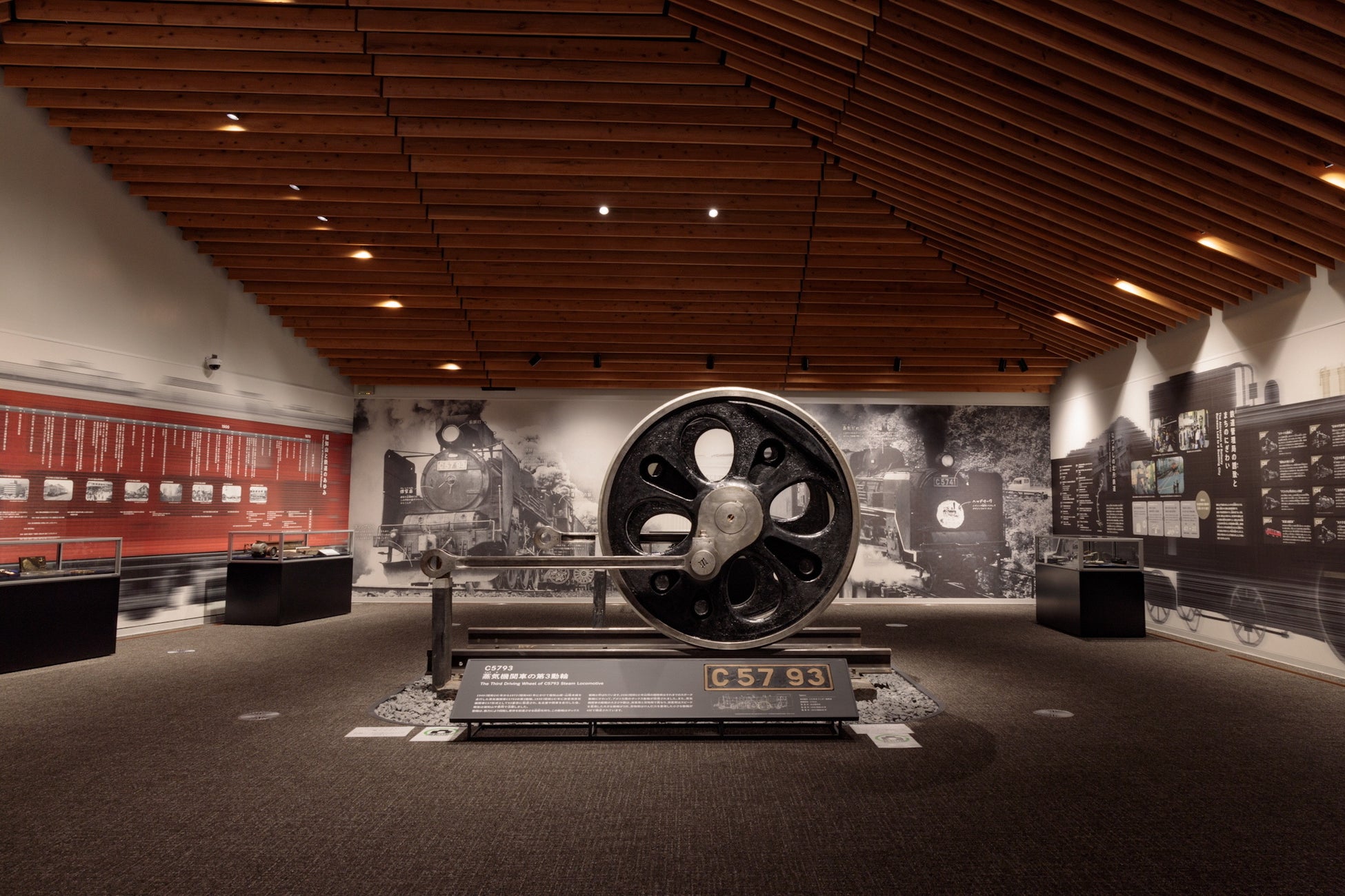 大迫力の蒸気機関車C1140と転車台を展示。旧福知山駅舎の屋根に使用されていたレールを、