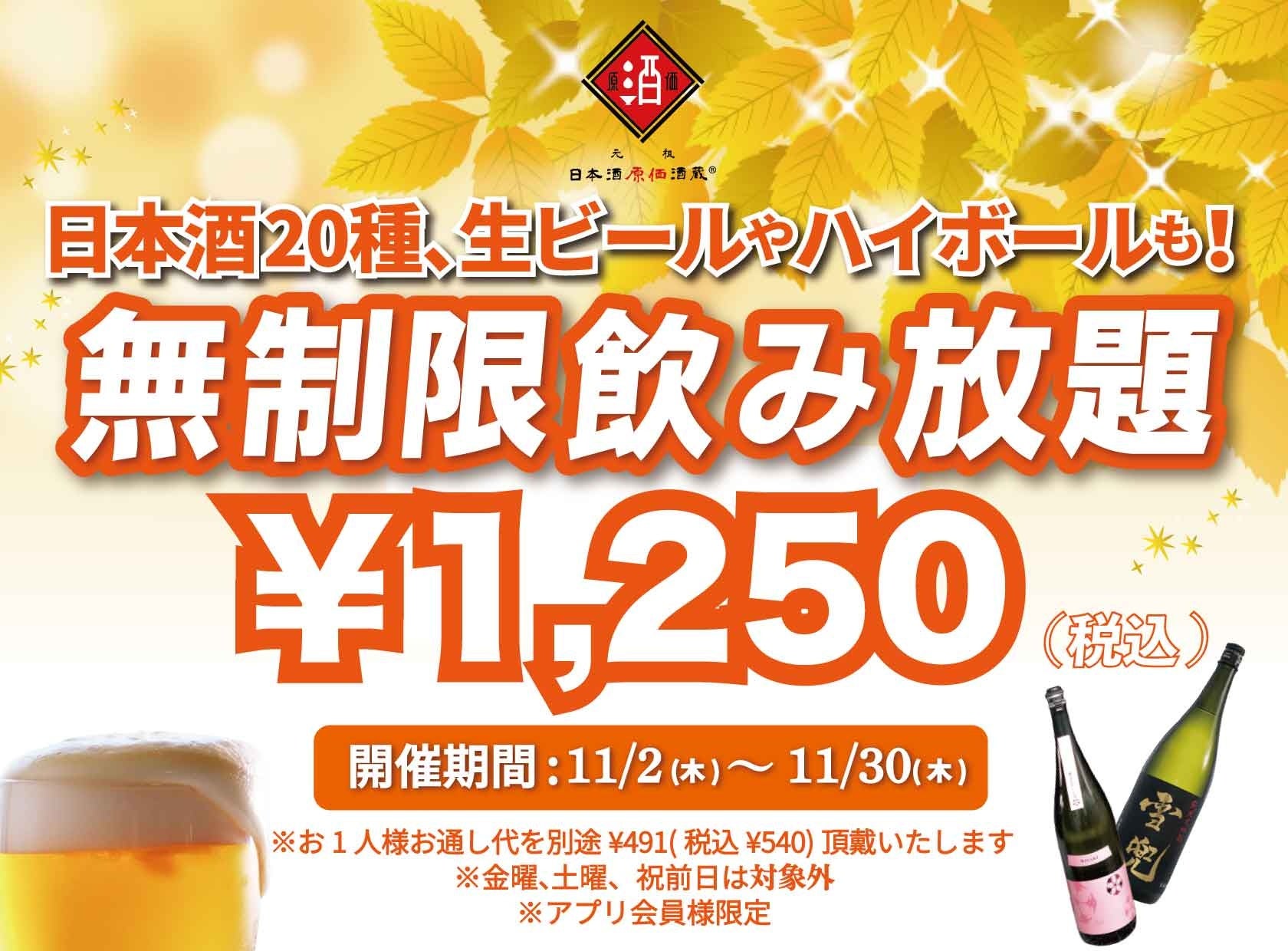 11月2日(木)~11月30日(木)に日本酒原価酒蔵にて時間無制限飲み放題¥1,250(税込)を開催します。
