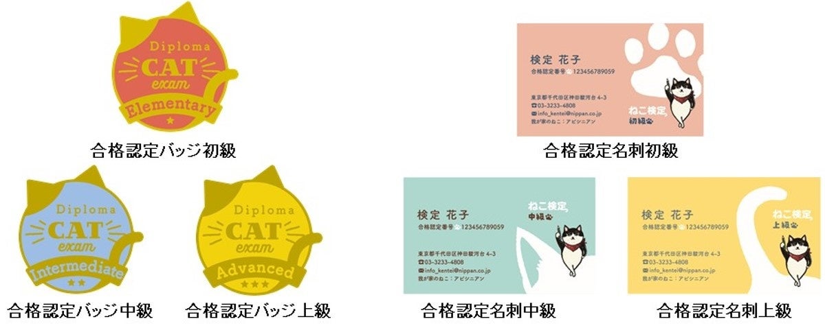 第7回より合格認定バッジと合格認定名刺デザインが新しくなりました。バッジは小ぶりでかわいいサイズ(10円玉大)なのでバッグやジャケットにさりげなく付けられます。名刺は愛猫の名前などお好きなねこ情報を入れられます。過去に合格された方も購入できますので、新しくなった特典をぜひ手に入れてください。