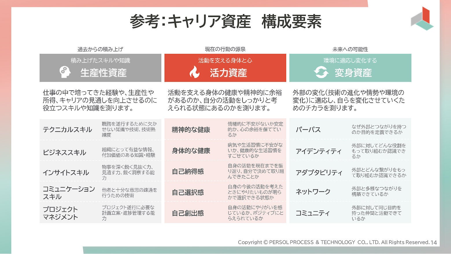 キャリア自律支援サービス『プロテア』では、社員の自律的なキャリア形成を図るため、法政大学キャリアデザイン 学部教授 田中研之輔氏と共同で、キャリア資産における3つの資産項目を独自に要素分解し、各資産の蓄積状況を可視化できるようにしました。