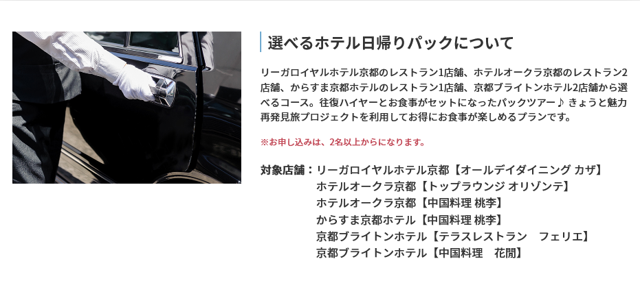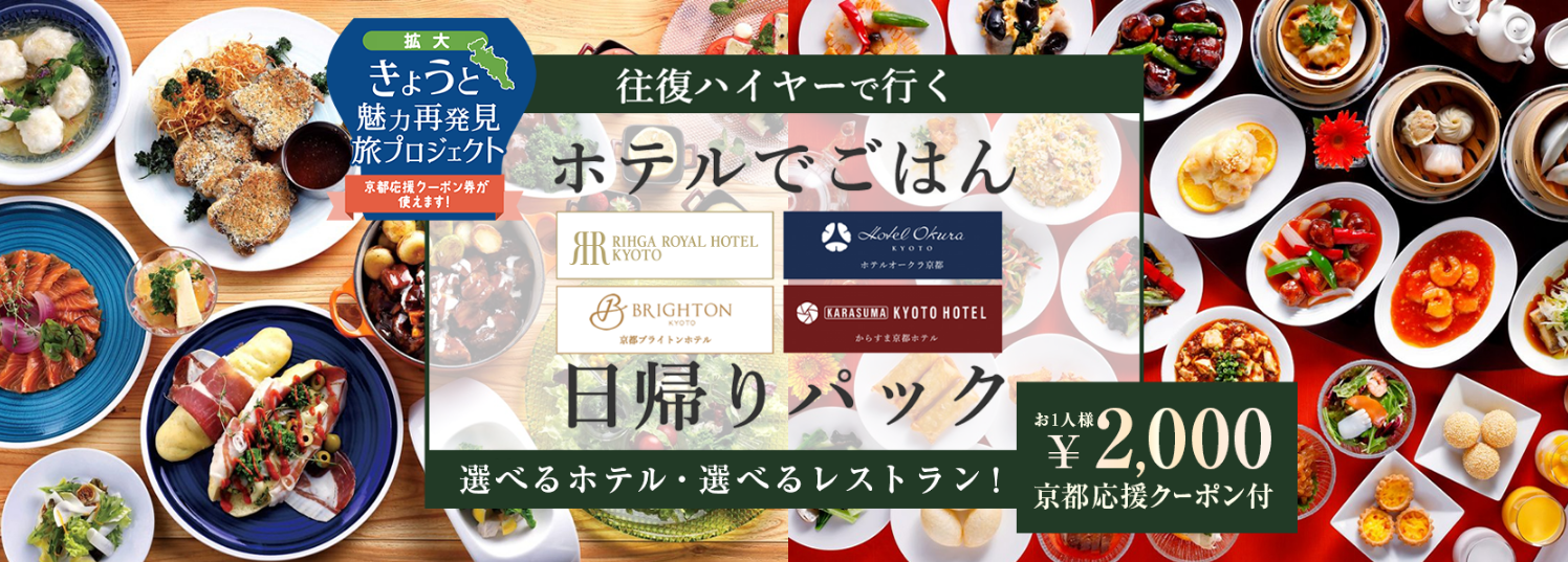 【きょうと魅力再発見プロジェクト】対象商品お一人様づつ2,000円のクーポン付4,000円で豪華ホテルでランチバイキング+往復ハイヤー+クーポンが付いてくるプラン