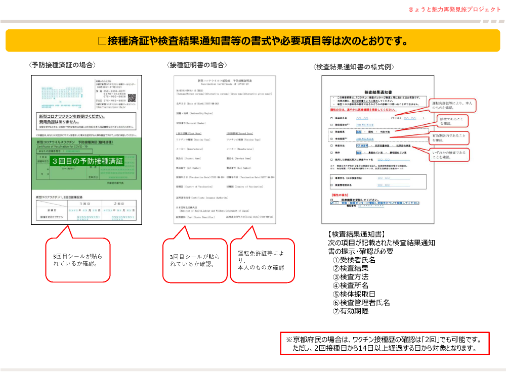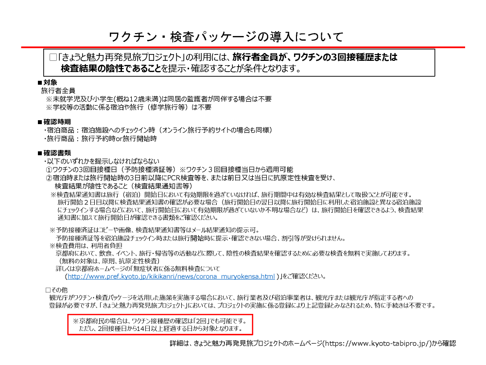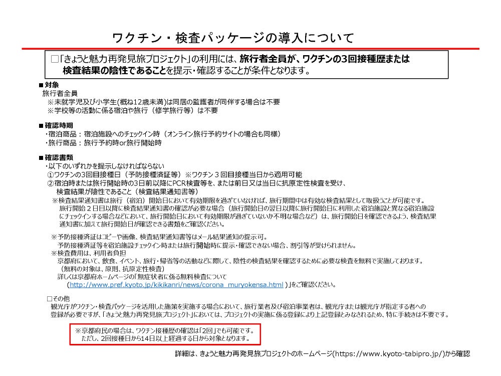 接種済証またはPCR検査等結果通知書(撮影画像、コピー、電子的な証明書でも可)の確認は、同行者も含めて旅行者全員について実施しますので、チェックイン時(旅行会社の場合は予約証明書等お渡しの来店時)にご提示ください。提示のない場合は割引支援を受けることができません。