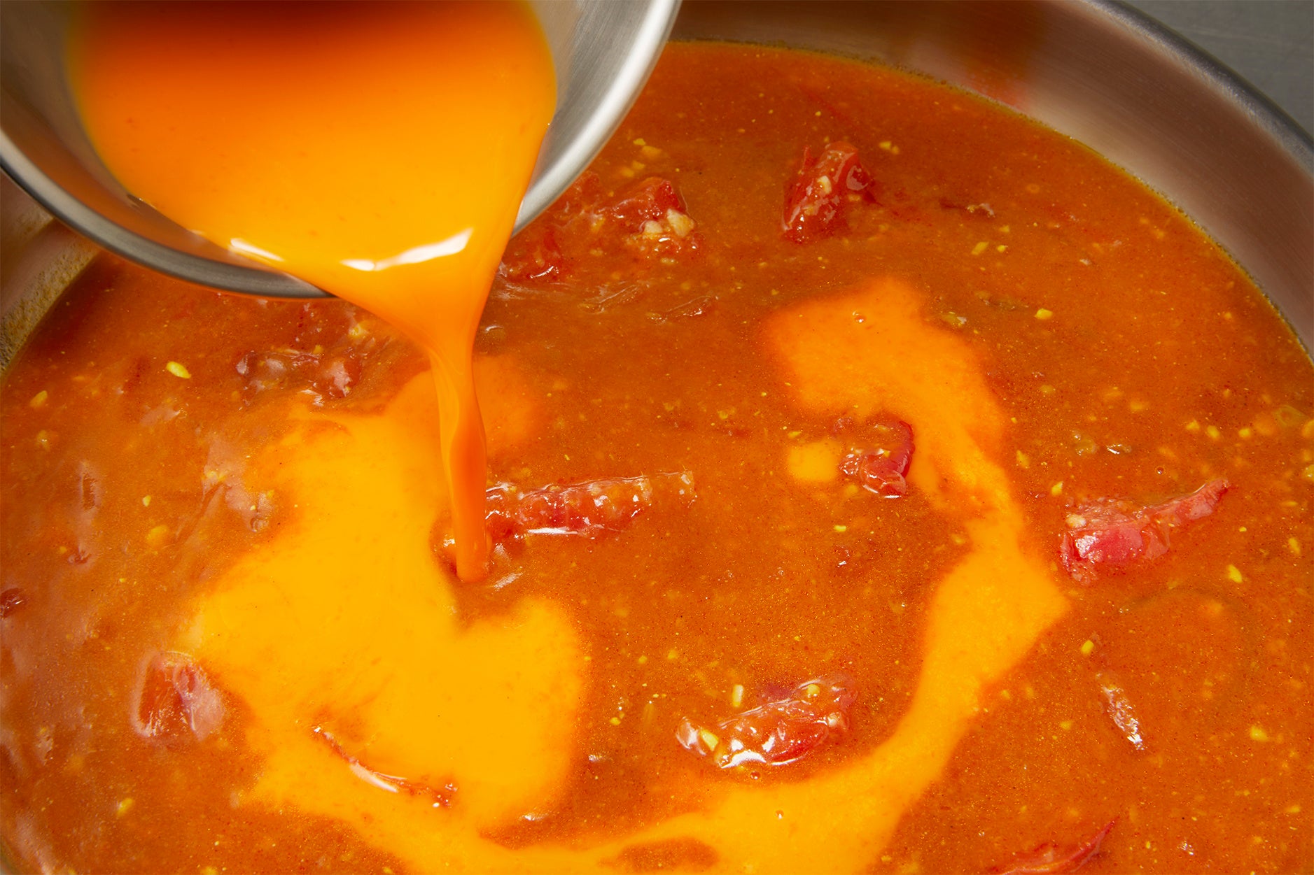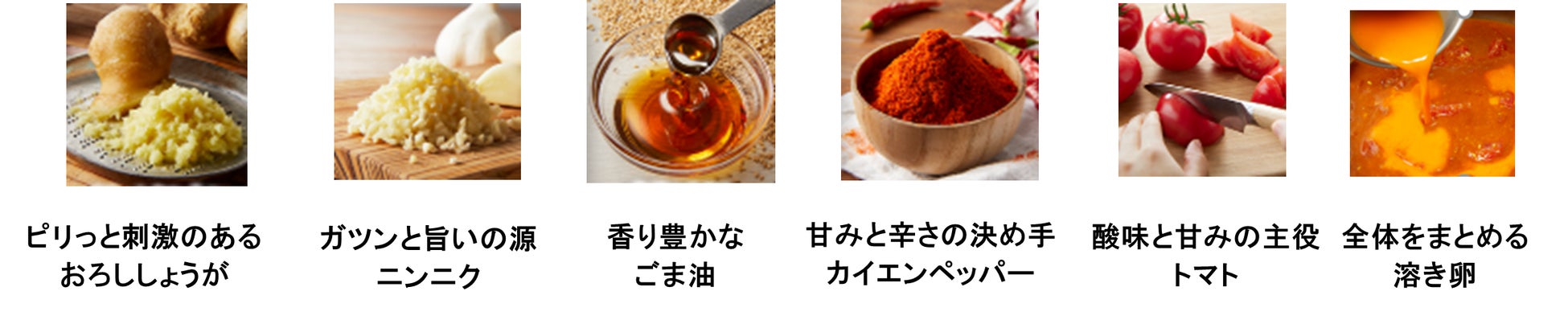 味わいの土台となるのは、おろししょうが、ニンニク、ごま油、そして辛さの決め手カイエンペッパー。選りすぐりの食材で、唯一無二の香りと辛さを実現しました。旨みがぎゅっとつまった丸亀製麺の特製のカレーだしと合わせて、お店で大きめにカットした生のトマトを投入。仕上げに、溶き卵を加えて、酸味と甘みを引き出し、味わい深い一杯に仕上げました。