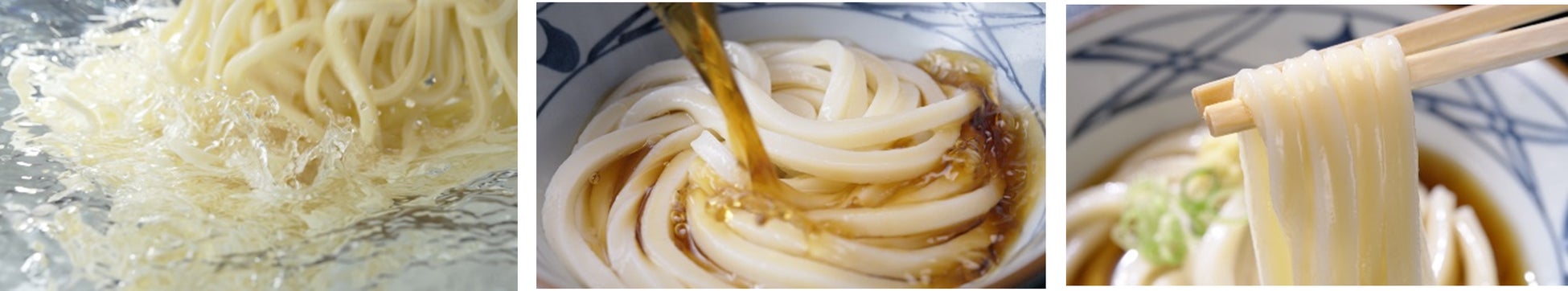 「おいしいうどん」は、徹底的に鮮度にこだわりぬいた「生きている」状態で提供されて初めて実現できる、と丸亀製麺は信じています。丸亀製麺がお届けするうどんは、国内 800 を超えるすべての店で一軒、一軒、手間を惜しまず、毎日、100%国産の小麦粉から打っています。打ち立てのうどんにこだわり、その場で切って、茹でて、作りたてをお客さまに提供しているからこそ、もちもちでおいしい独自の“丸亀食感”をお届けできています。