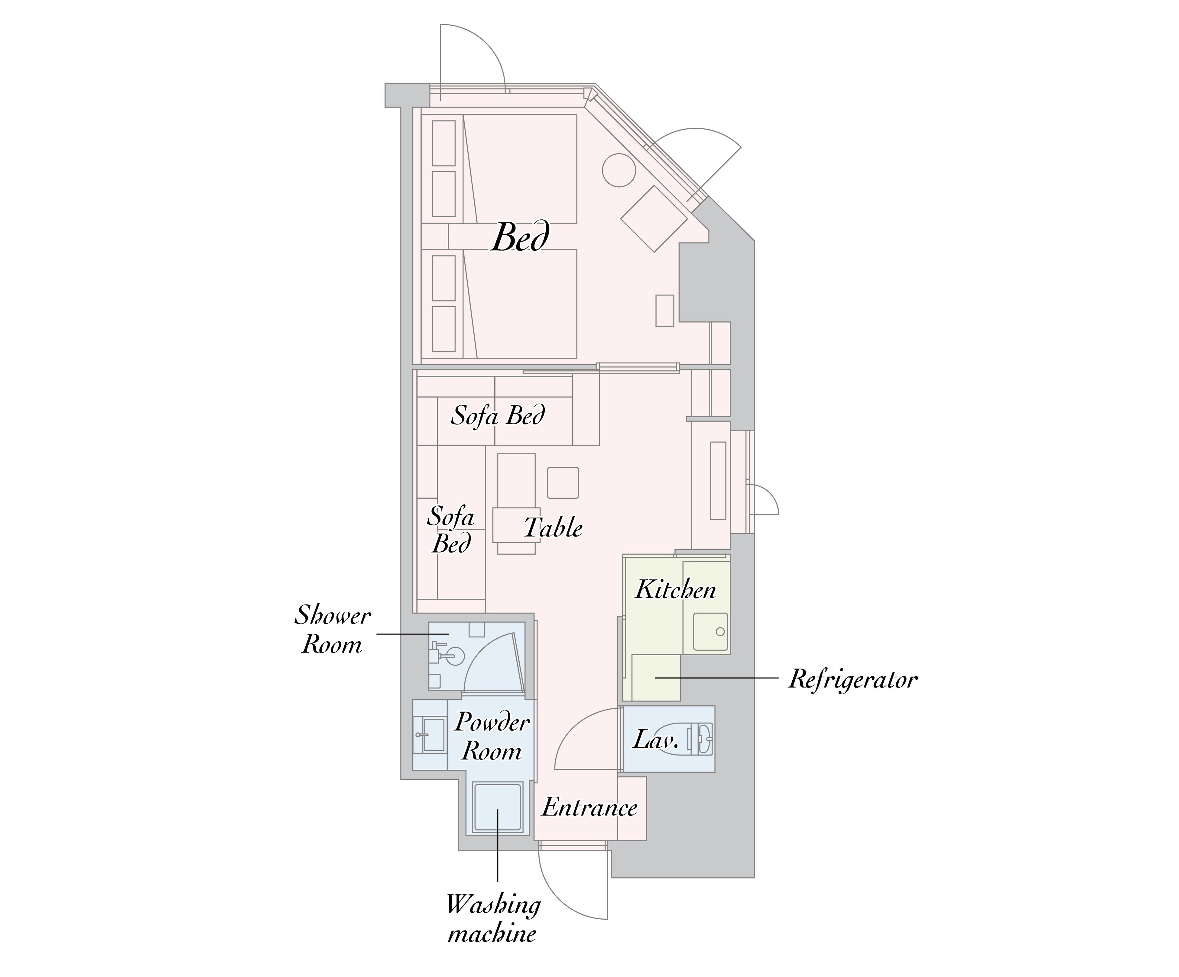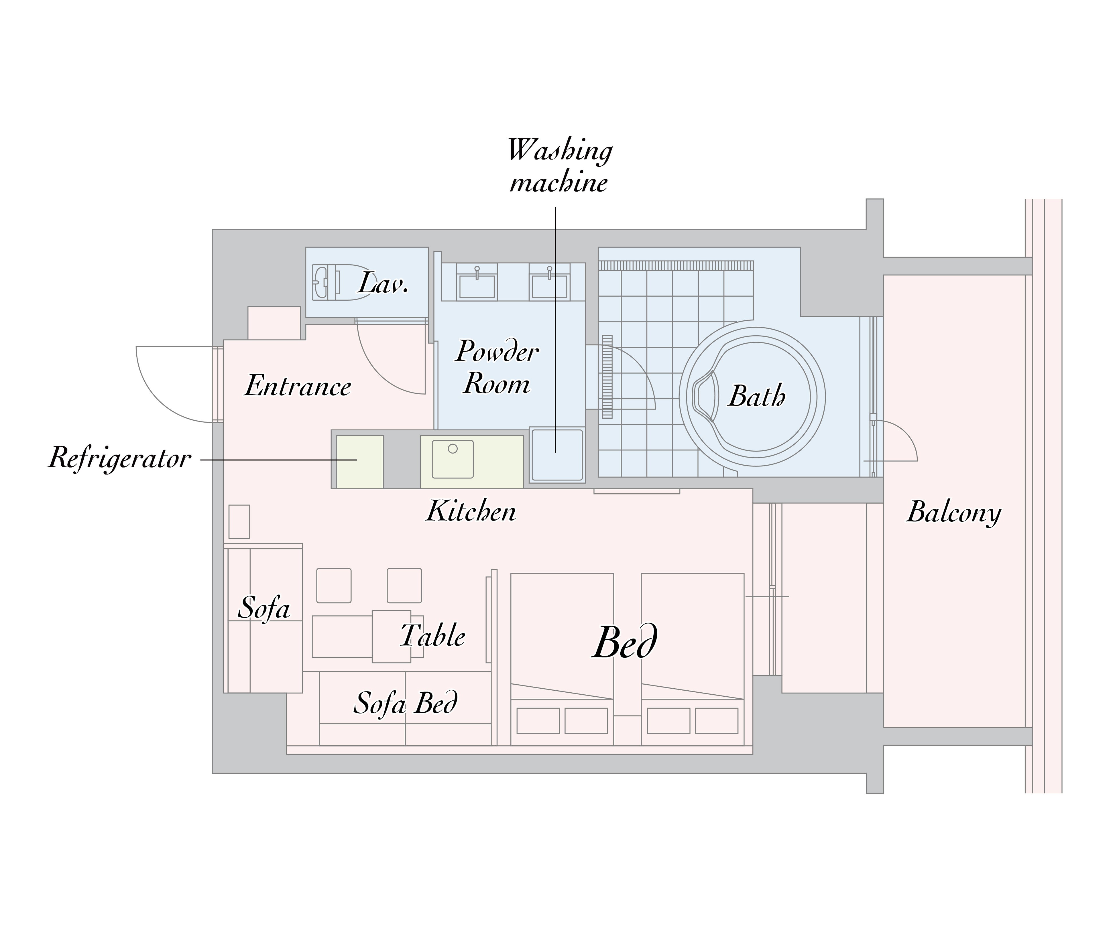全57室すべてがゆとりあるスイートルーム仕様。グレイッシュなトーンで統一された落ち着きのある空間に、キッチン、冷蔵庫、電子レンジ、洗濯乾燥機を完備しました。一部客室には専用ジャグジーやバルコニーも備えています。