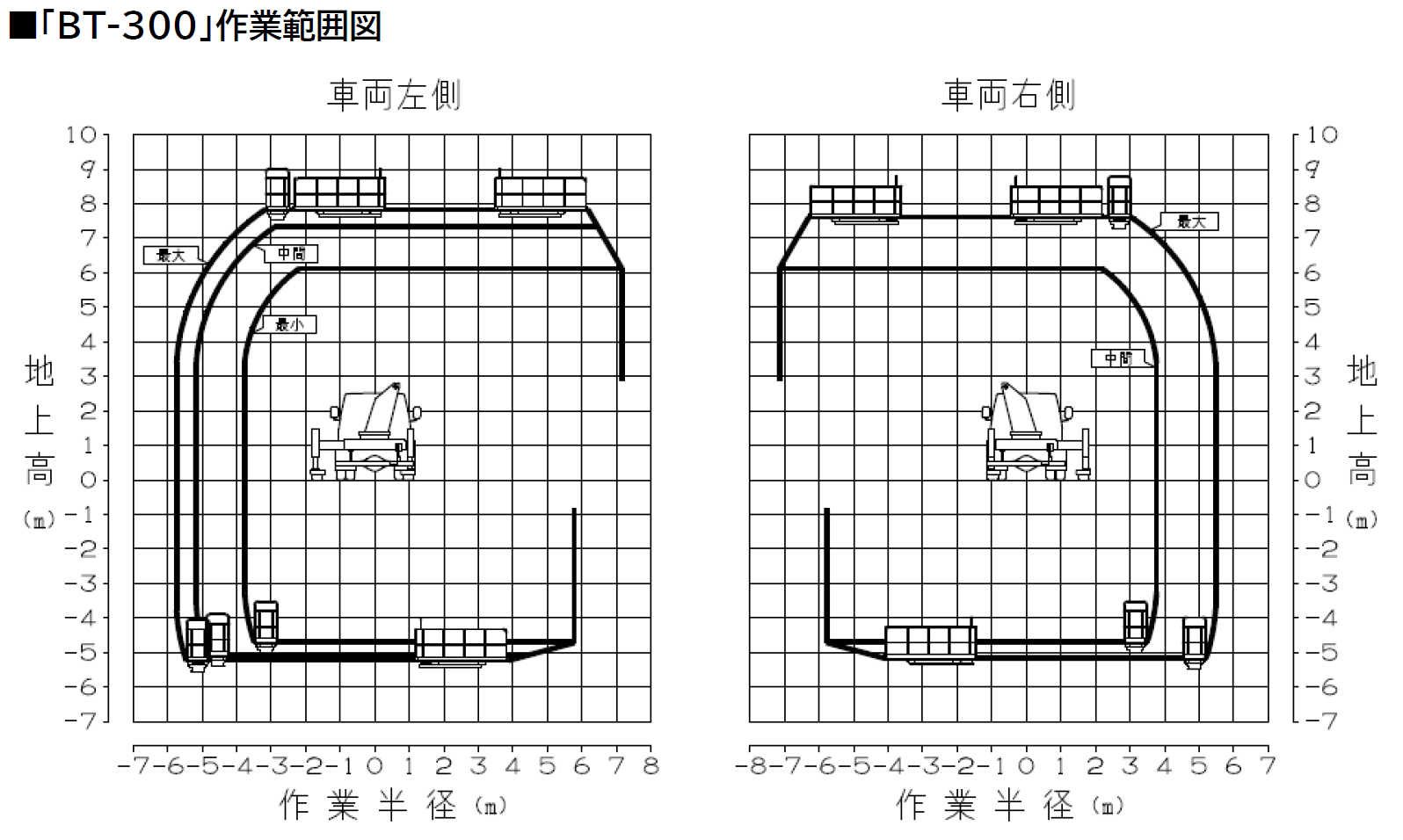 ②車体の左右両側に3段式のブーム展開が可能
