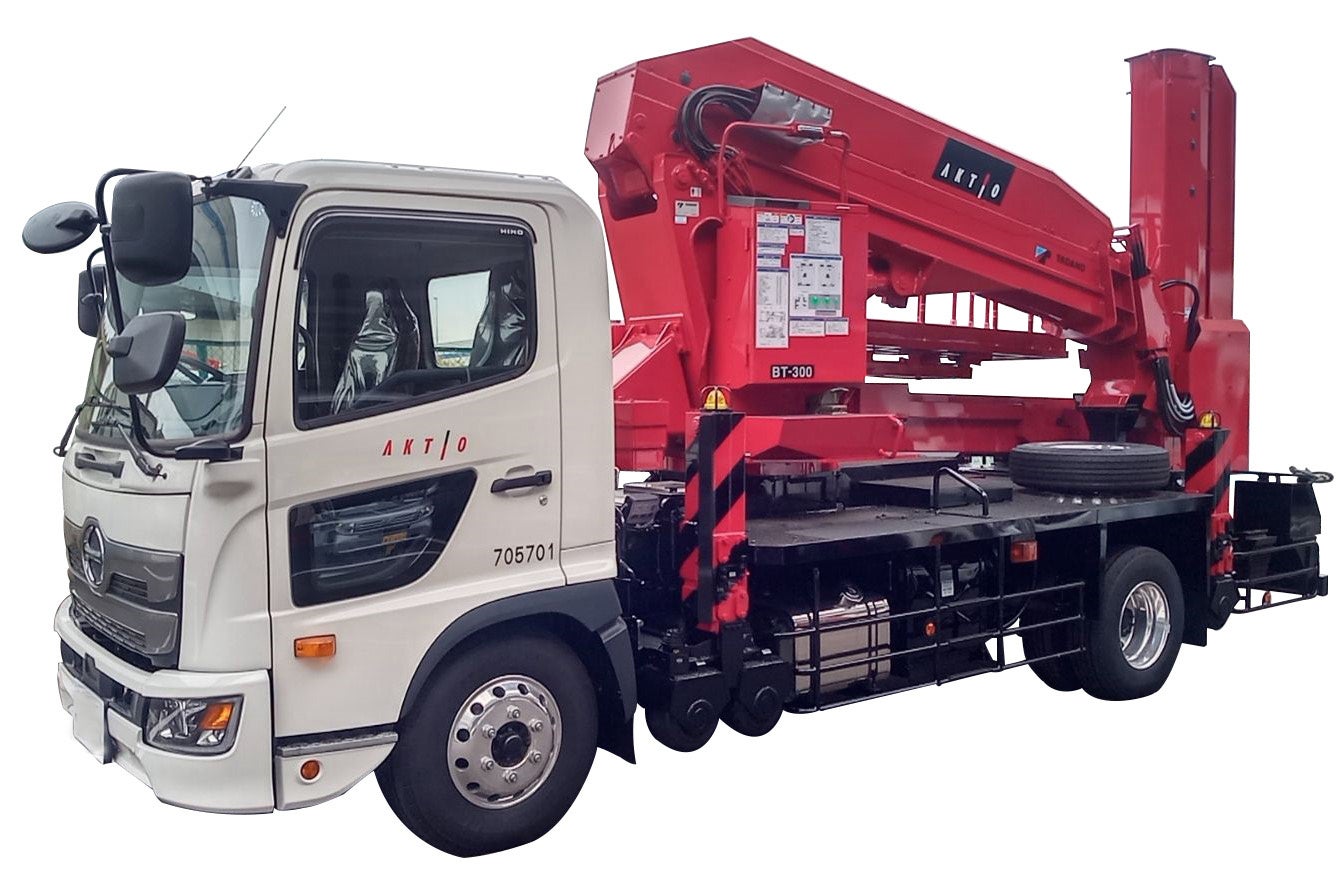 中型橋梁点検車「BT-300」の最大の特徴は、橋梁点検の際にブームを左右両側に展開できる点です。これまでのBTシリーズでは、車両左側のブーム展開のみで、車両右側の作業を行うことができませんでした。今回の「BT-300」は、一方通行の高速道路や自動車専用道路の追い越し車線側から桁下アプローチが可能となります。また、デッキ最大差し込み長さは8.7mで、デッキ本体は180度旋回が可能なため作業領域が広く、効率的な作業ができます。