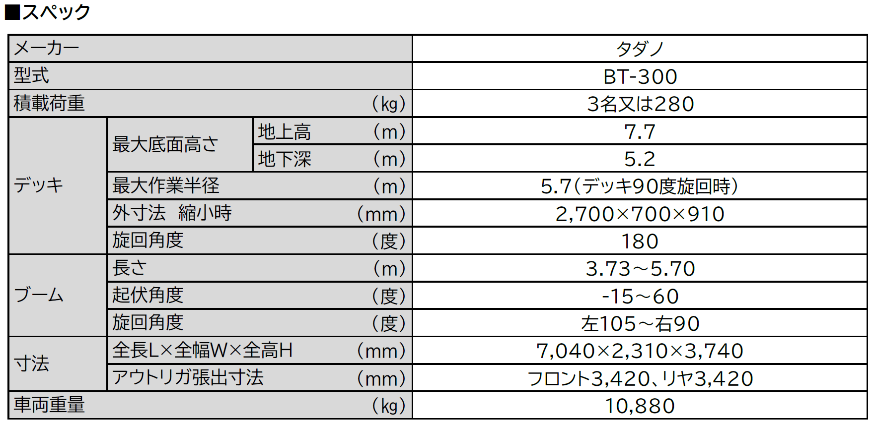 ③デッキ積載荷重は280kgで作業者3名の搭乗が可能