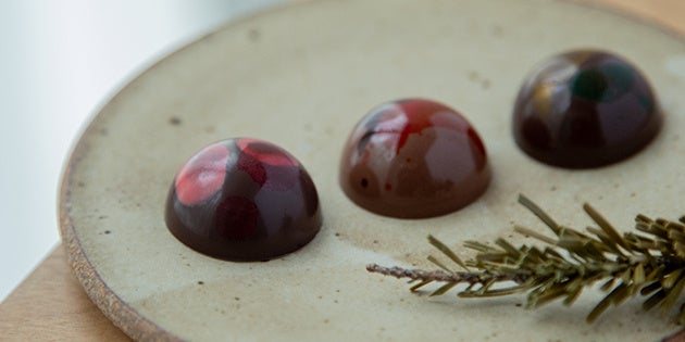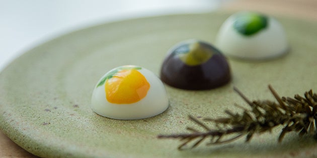 「翠の香り」をテーマに、ハーブや野草を使ってどこか記憶にある香りを表現した3種類のボンボンショコラアソート。レモンマートル(左)、ウィンターセイボリー(中)、もみ(右)