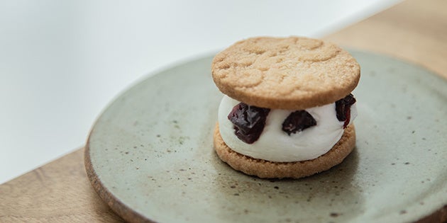 細やかな模様が入ったサクサクのサブレに、コクのあるミルキーなバタークリームと自家製のいちごシロップに漬け込んだクランベリーをサンド。