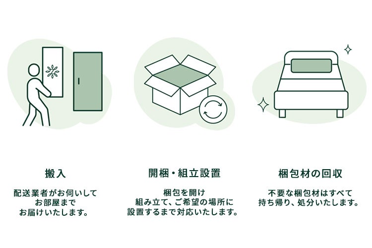 組立&設置サービスとは、「マットレスの搬入・設置」や「ベッドフレームの搬入・組立・設置」をプロが行うものです。重いマットレスの設置や大きなベッドフレームの組み立てが難しい方、新生活の準備をスムーズに進めたい方などに最適なサービスです。特に家具の組立設置サービスの需要が高まる新生活シーズンに合わせ、お客様の利便性を高めてまいります。