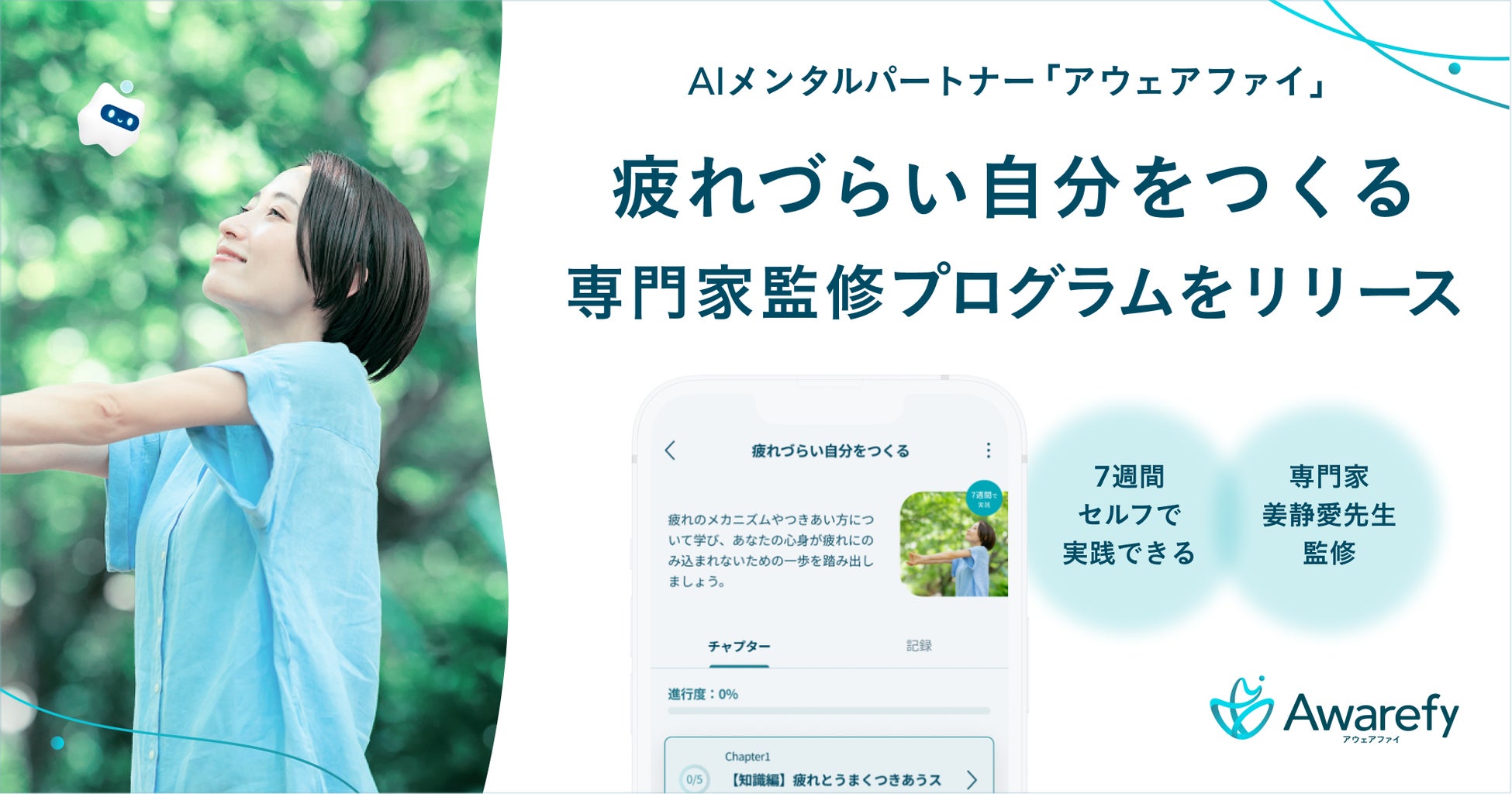 株式会社Awarefy(本社:東京都新宿区、代表取締役 CEO 小川 晋一郎、以下「アウェアファイ」)は、2025年8月1日(金)、AIメンタルパートナー「アウェアファイ」アプリにおいて、日々の疲れとうまくつきあうために役立つ「考え方」や「行動」を学ベるプログラム『疲れづらい自分をつくる学習コース』をリリースいたしました。