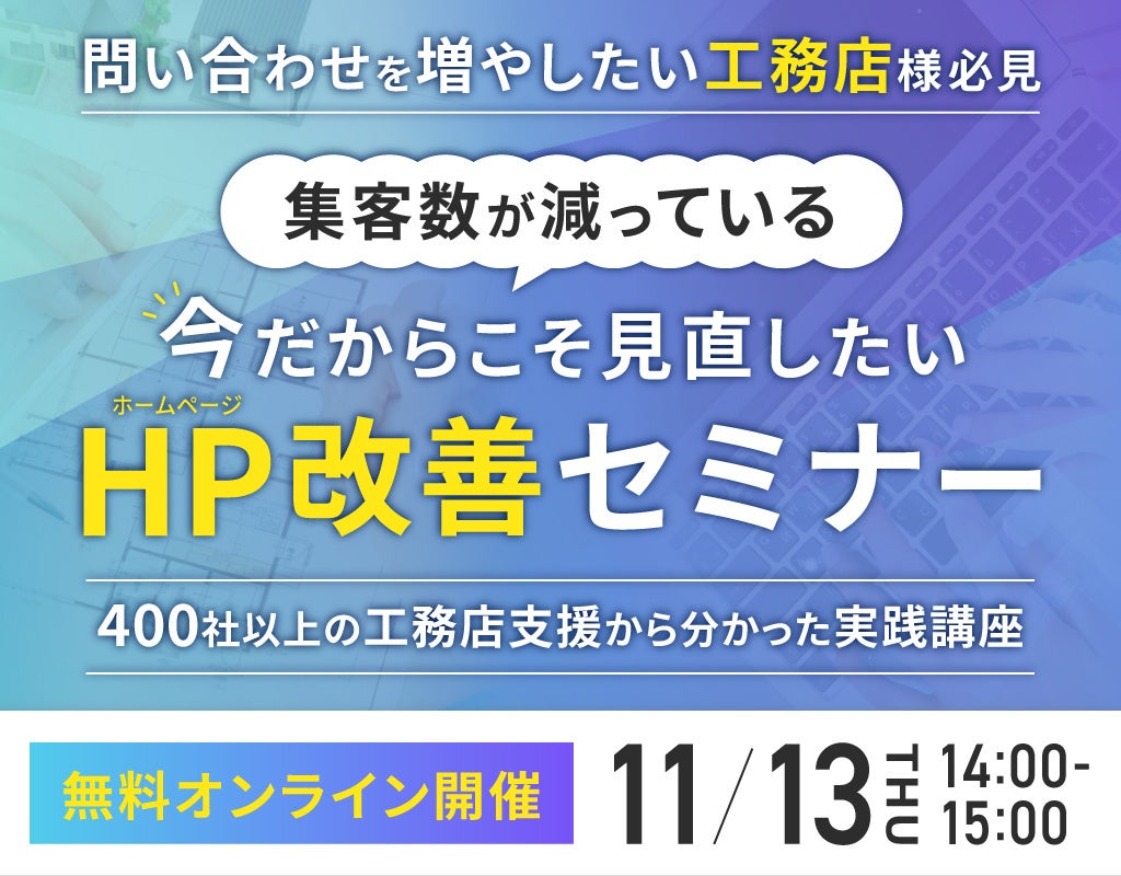 【無料】問い合わせを増やしたい工務店様必見! 集客数が減っている今だからこそ見直したいHP改善セミナー11/13(木)【シンミドウ】