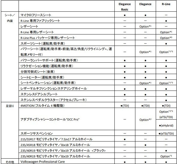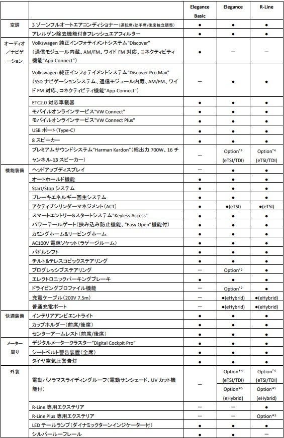 グレードは、”Travel Assist”やレーンキープアシストシステム”Lane Assist”、 レーンチェンジアシストシステム"Side Assist Plus"などの最新の運転支援システムをすべて標準装備とした『Elegance Basic』(1.5eTSIのみ)をエントリーグレードに設定し、15インチの大型タッチディスプレイを備えた純正インフォテイメントシステム”Discover Pro Max”やヘッドアップディスプレイを標準装備した『Elegance』、そして専用エクステリアを身に纏い、専用シートや19インチアルミホイールを装着した『R-Line』の3グレードを設定し、計7グレード展開となります。