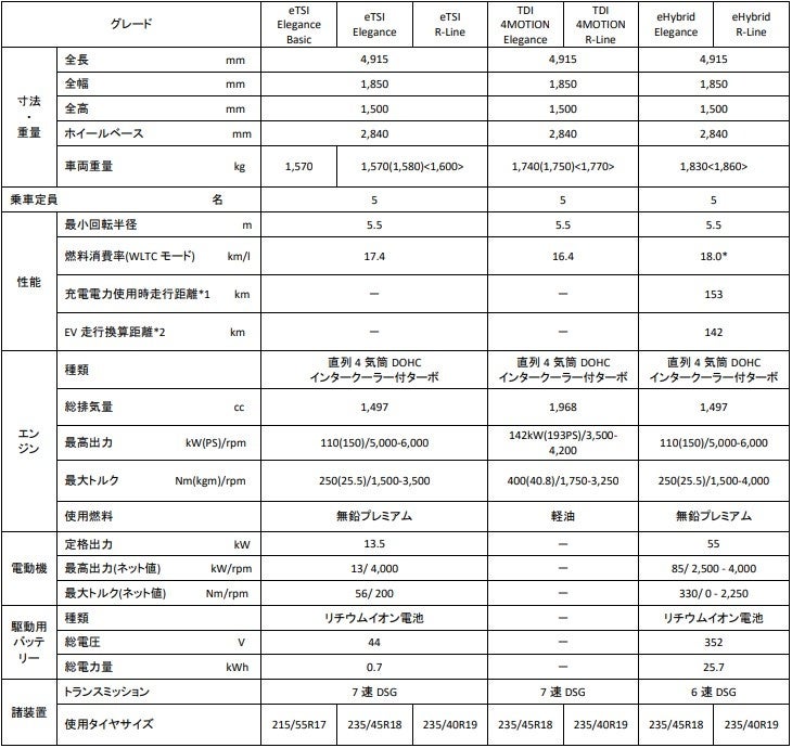 - eHybrid R-Line 1.5L eTSI PHEV (110kW/150PS) / 6速DSG / FWD