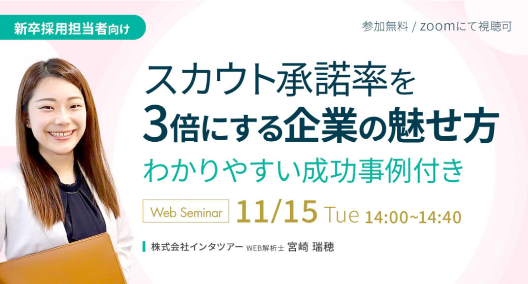 新卒採用向けのリレーション採用プラットフォームを提供する(株)インタツアー(代表:作馬 誠大、本社:東京都港区浜松町)は、2022年11月15日(火)に、新卒採用担当者向けオンラインセミナー『スカウト承諾率を3倍にする企業の魅せ方 わかりやすい成功事例付き』を開催いたします。