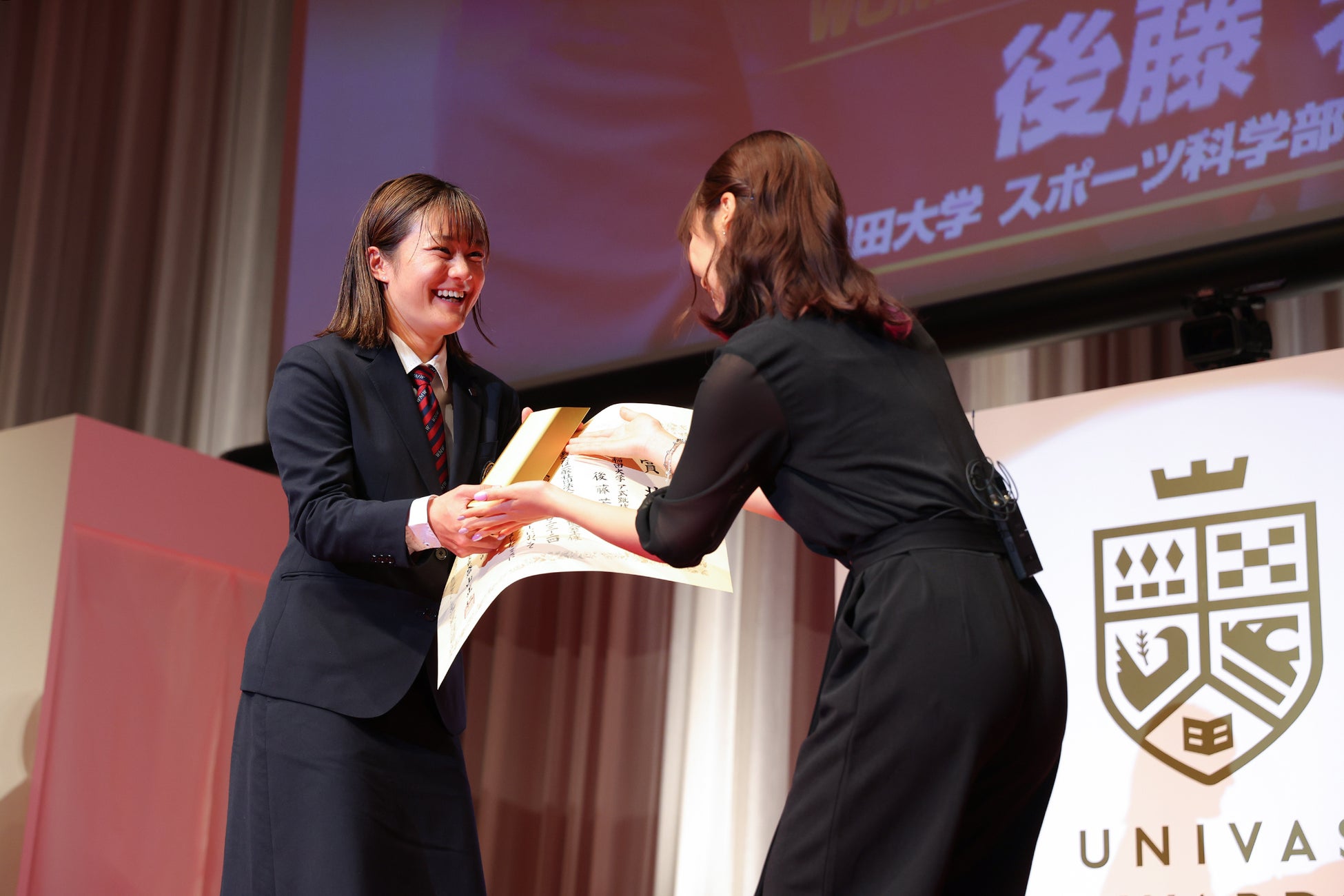 当日は、2023年度全日本学生選手権大会IVISION1 男女混成部門の準優勝、世界選手権大会に6名の選手が日本代表として出場した立命館大学応援団チアリーダー部ピーウィーズの明るい笑顔と華麗な演舞や、力強いパフォーマンスを披露してくれた東北大学ストリートダンスサークルWHO(フー)の皆様が受賞者を祝いました。2024年8月のパリオリンピックで金メダルを獲得した櫻井つぐみ選手(育英大学4年当時)や、WEリーグの三菱重工浦和レッズレディースで活躍する後藤若葉選手(早稲田大学4年当時)など、学生時代に文武両道を実践し、現在も社会で活躍するアスリートがこの表彰式で受賞されています。柔道48kg級の角田夏実選手は、日本のメダル第一号として日本中に感動を届け、大学スポーツで培った経験と努力の積み重ねにより、素晴らしい成績を収めました。学生たちへエールも送り、アスリートとしての姿勢を示しました。