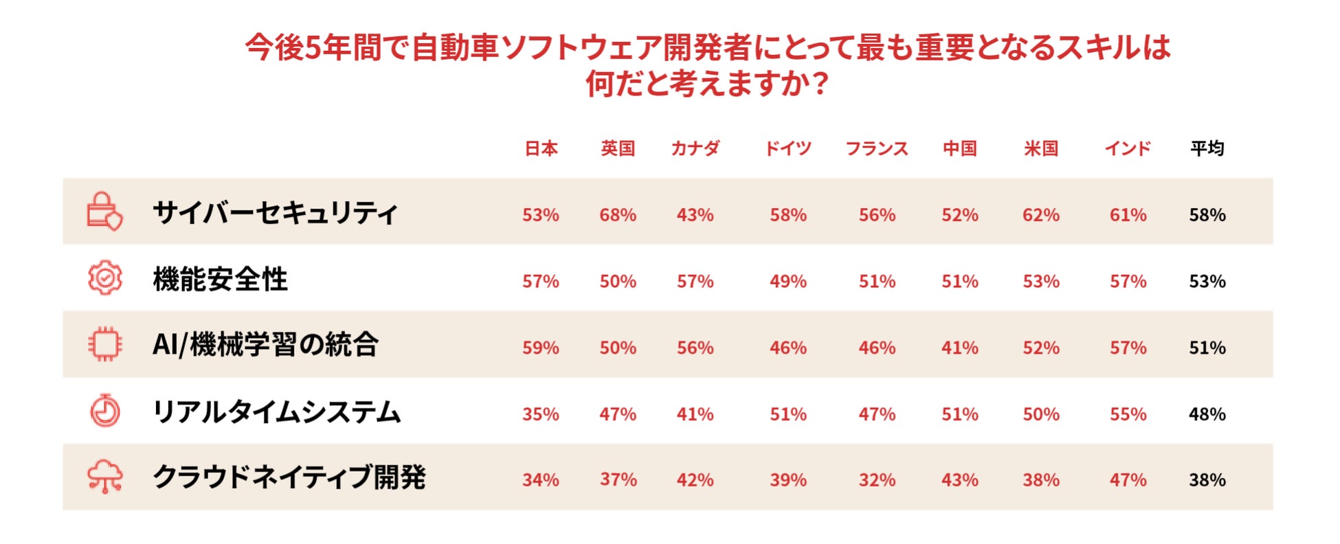 こうした中、最も困難と感じている規制の種類は、「サイバーセキュリティ」(49%)、「機能安全」(42%)、「AI/機械学習関連」(38%)で、いずれもグローバル平均を上回っています。これら3つの分野は、今後5年間で最も重要となるスキルとしても認識されており、「AI/機械学習の統合」(59%、グローバル平均51%)、「機能安全性」(57%、同53%)、「サイバーセキュリティ」(53%、同58%)との結果が示されました。特に「AI/機械学習関連」は規制分野における課題でも上位に位置付けられており、AIと機械学習は、日本のSDV開発環境において規制とスキルの両面で重視されていることがわかります。