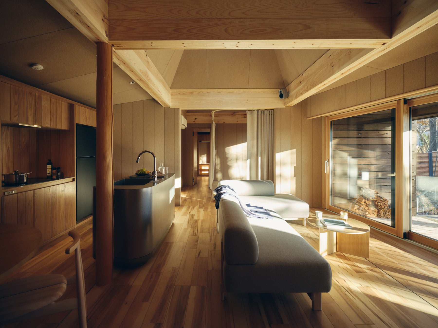 広々とした室内空間と、全棟に備えたプライベートサウナが特徴です。家族や仲間と気兼ねなく過ごせるレイアウトで、焚き火台も設置。一部の棟ではDog Friendlyにも対応しています。