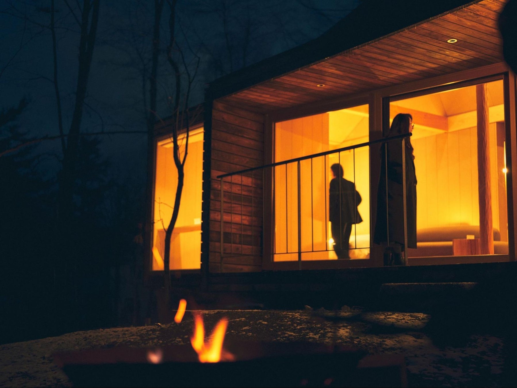 夕食は御代田エリアの“いつもの店”へ。キャビンに戻って焚き火を囲み、その日の出来事を語らいながら過ごす夜。好きな本を読み、静かな時間に浸る。