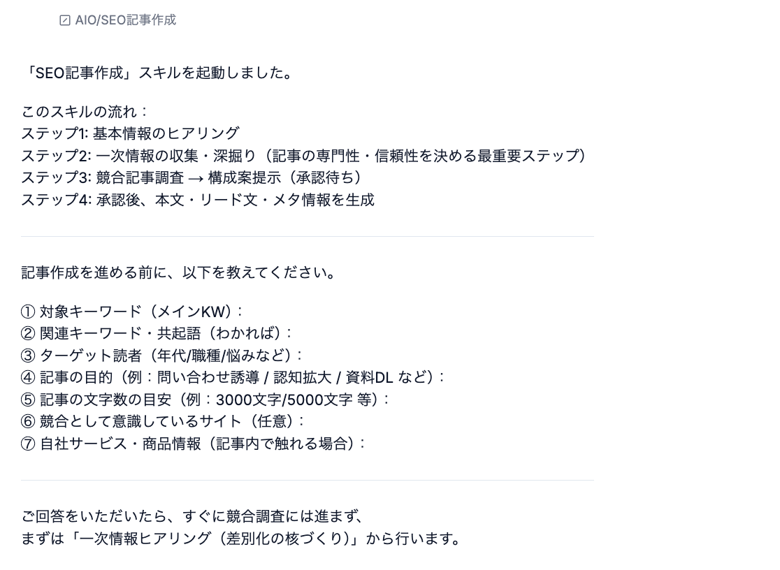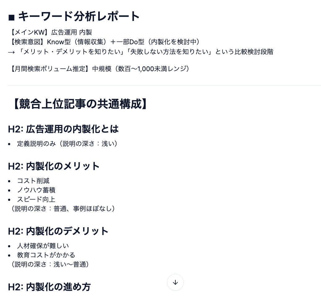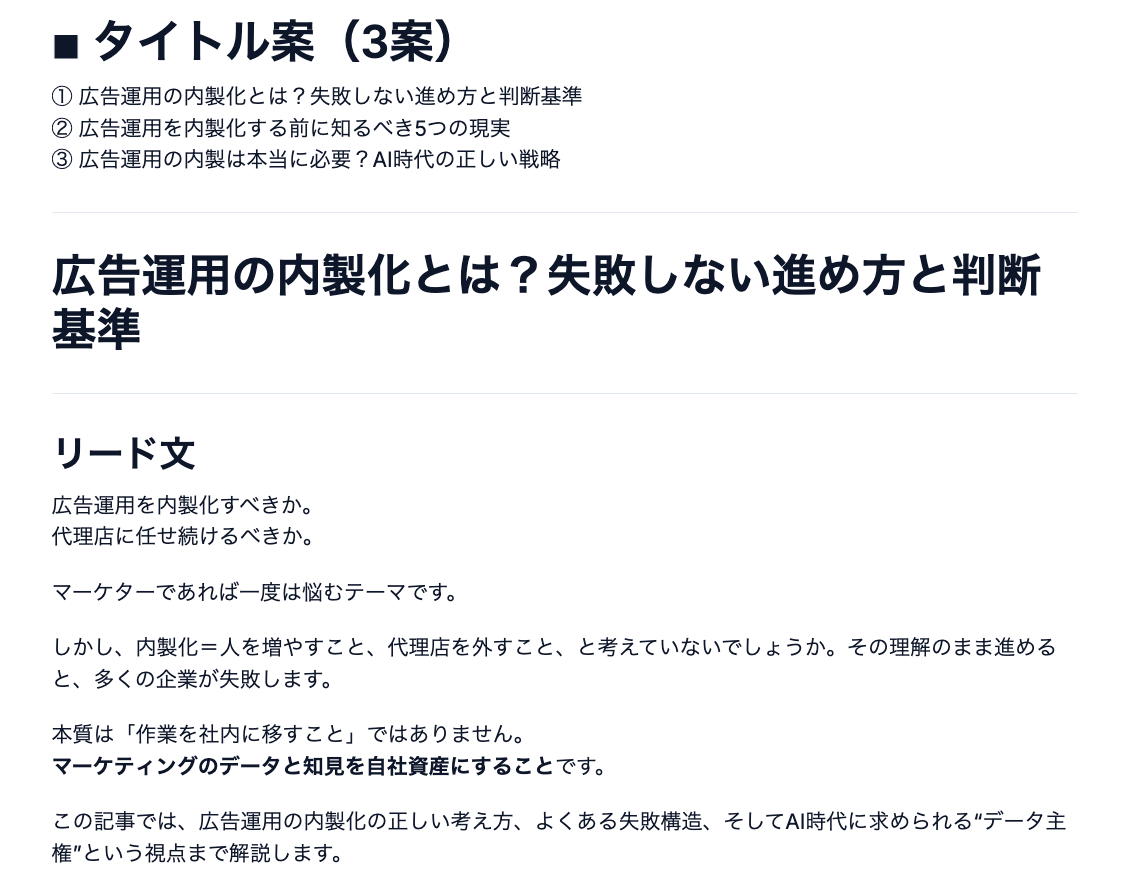 専門的なSEO知識がなくても、AIが「どのキーワードをどこに配置すべきか」「読者の検索意図に応えるにはどんな構成が適切か」といった判断を担うため、コンテンツ担当者は本来の「何を伝えたいか」に集中できます。