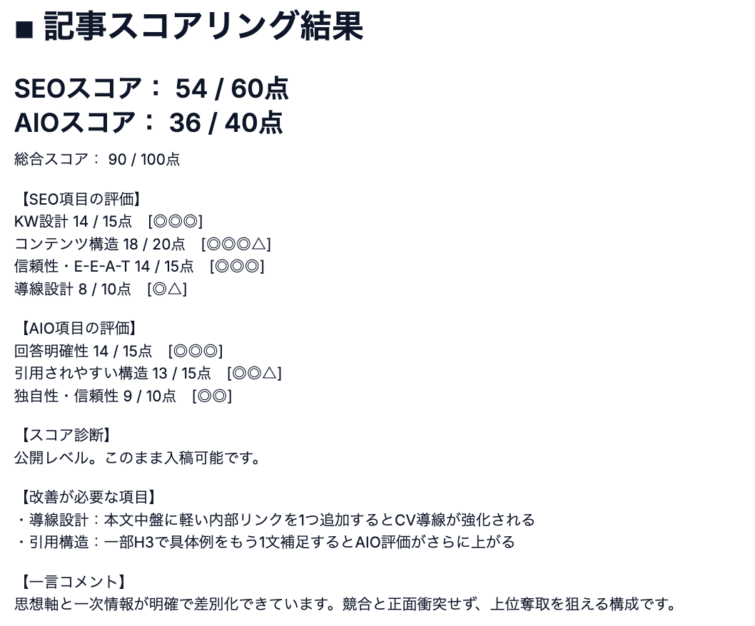 AIとの会話を重ねるだけで、検索エンジン・AI検索(AIO)の双方に最適化された記事が完成します。仕上げには自動スコアリングが実施され、客観的な品質評価に基づくブラッシュアップが可能です。