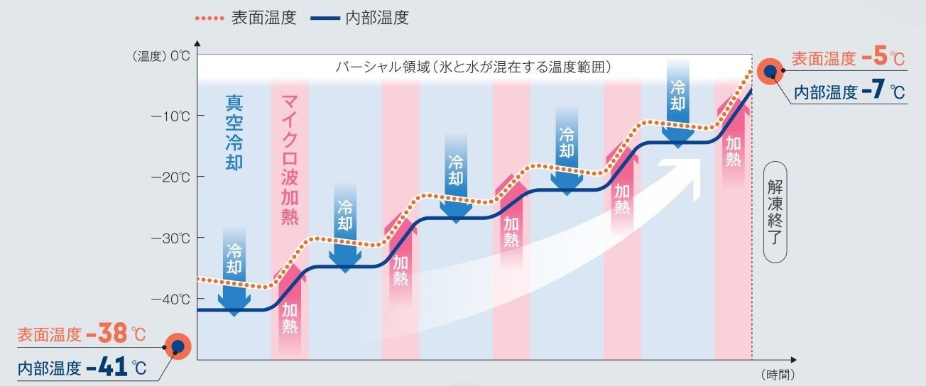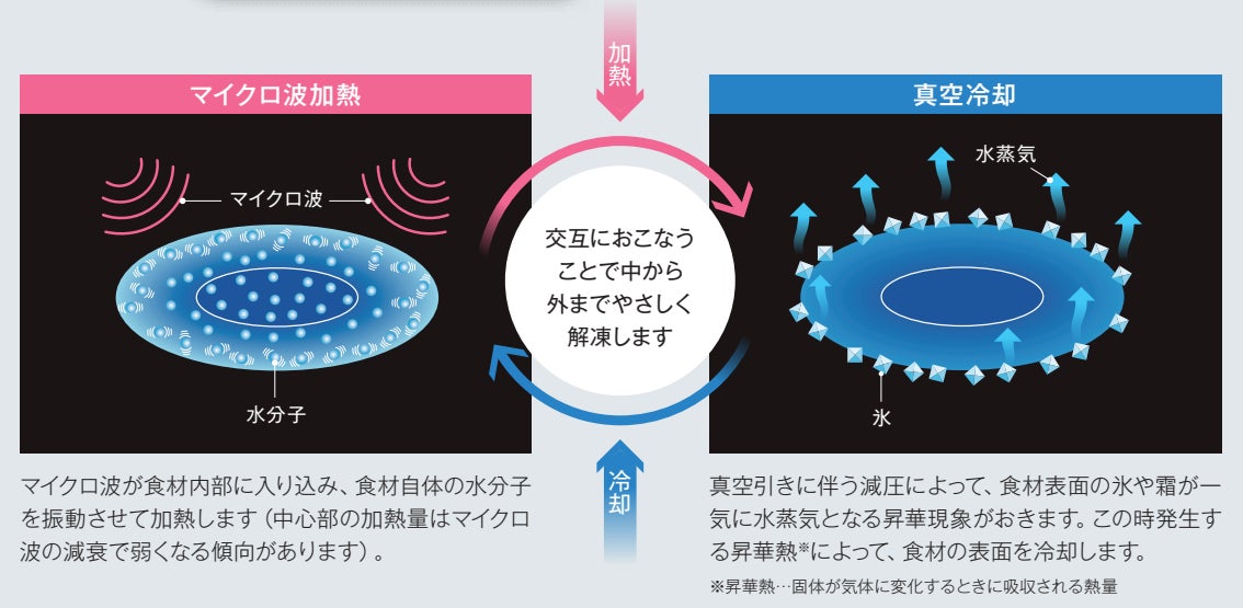温塩水解凍(約40度の温かい塩水を使った解凍)、流水解凍などの一般的な食材解凍方法では、溶けやすい表面と溶けにくい内部の解凍ムラが発生します。本製品は、食材全体を電子レンジと同じマイクロ波で加熱しながら、マイクロ波により加熱されやすい食材表面を真空冷却し、食材表面と内部の温度差を広げずに解凍するものです。真空とすることで庫内が減圧され水の沸点が下がり、食材表面の氷が水にならず直接水蒸気になる昇華現象が起こります。この昇華現象の際に周りの熱を奪うため、食材表面の温度が下がります。表面と内部の温度差が小さい解凍により、うまみ成分(ドリップ)流出の原因となる細胞の損傷を抑制し、解凍ムラが少なく、より美味しい、高品質の解凍を実現します。