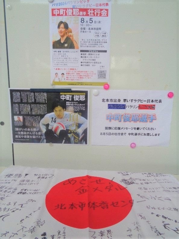 パリ2024パラリンピックの車いすラグビー日本代表に選出されている、北本市出身の中町俊耶選手の応援ブースを北本市役所・体育センターに設置しています。ブースでは、中町選手への応援メッセージを募集中です。