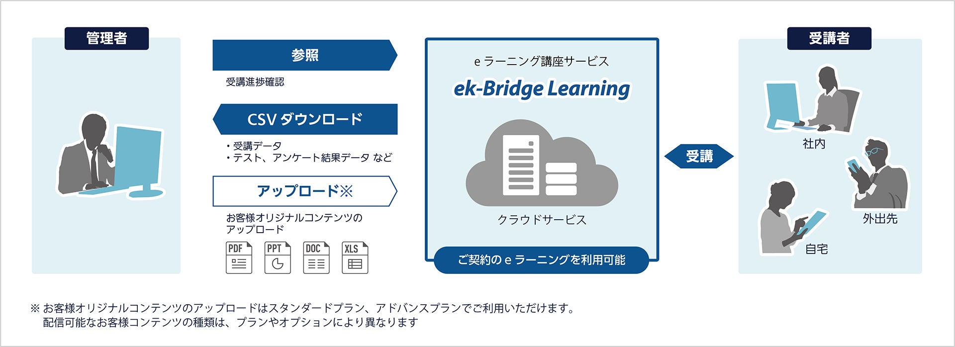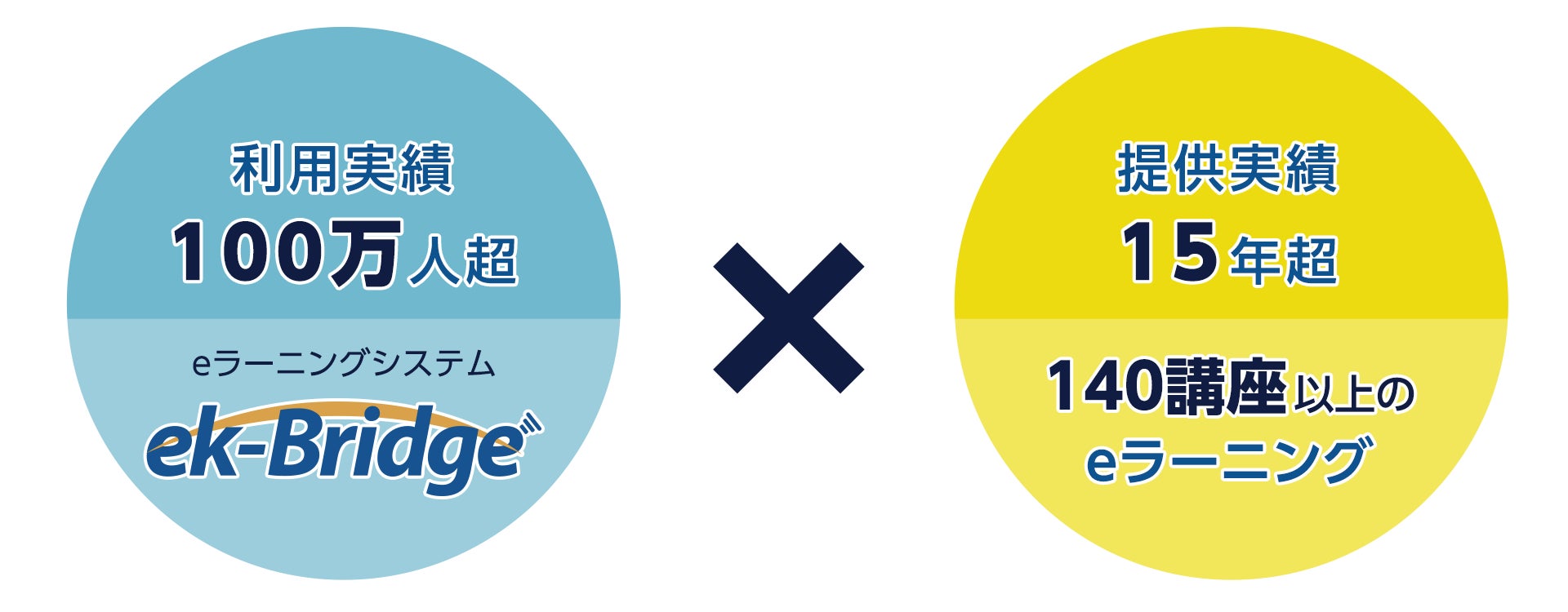 「ek-Bridge Learning」はLMS※4「ek-Bridge」(eラーニングシステム)と、eラーニング講座をセットにしたeラーニング講座サービスです。LMSや教材をお持ちでなくても、すぐにeラーニングを開始できます。