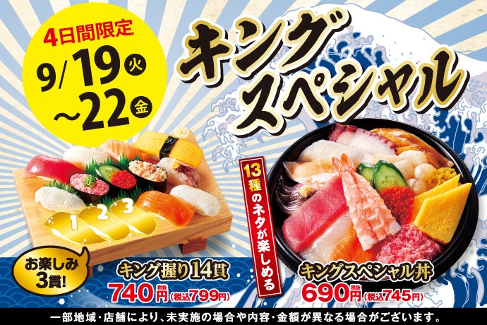 持ち帰り寿し店の「⼩僧寿し」「茶⽉」を運営する株式会社⼩僧寿しは、持ち帰り寿し店「⼩僧寿し」にて、9月19日(火)~22日(金)の期間限定で、「キングスペシャルフェア」を開催致します。