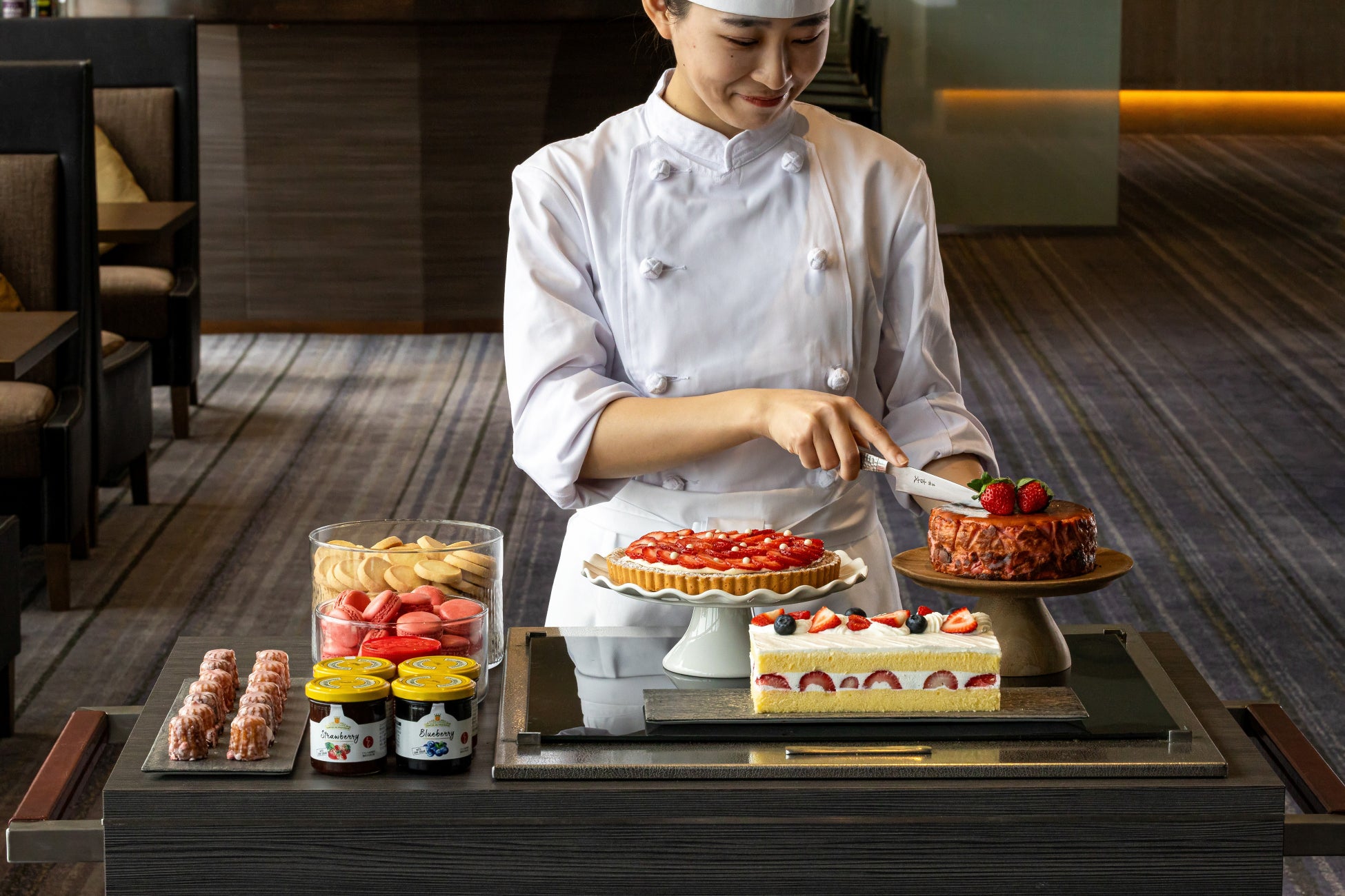 また、第一部・第二部(11:30~/13:30~)ではケーキスタンドに加え、じっくりと火入れした鴨のモモ肉と白インゲン、ベーコン、コーンをトマトベースで煮込んだ「カスレ」または、低温調理したサーモンに赤パプリカとトマトをじっくりと煮こんで素材そのものの旨味を引き出したソースをあしらった「サーモンピペラード」からお好きなメインディッシュをお選びいただけます。第三部(15:30~)では、ケーキスタンドに加えスイーツのワゴンサービスが登場。「レモンいちごタルト」、「いちごバスクチーズケーキ」や定番の「いちごのショートケーキ」、「マカロン」、「クッキー」、「カヌレ」の計6種のスイーツが並び、お好きなスイーツをお好きなだけご堪能いただけます。