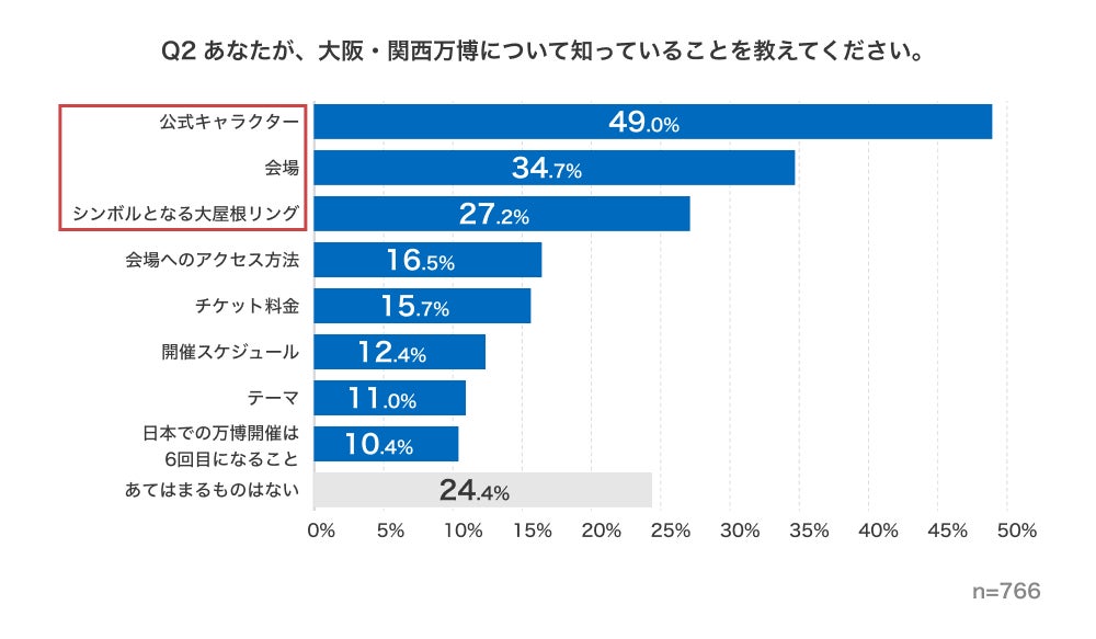 大阪・関西万博について知っていることを聞いたところ、「公式キャラクター」(49.0%)が最も高く、「会場」(34.7%)、「シンボルとなる大屋根リング」(27.2%)が続きました。