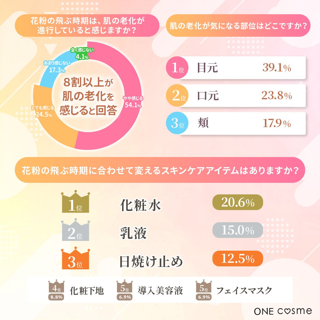 【花粉が飛ぶ時期は、肌の老化が進行していると感じますか?/花粉が飛ぶ時期に、肌の老化が気になる部分はどこせすか?/花粉が飛ぶ時期に合わせて買えるスキンケアはありますか?】