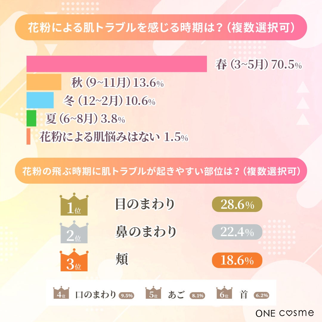 【花粉による肌トラブルを感じる時期を教えてください(複数選択可)また、花粉の飛ぶ時期に肌トラブルが起きやすい部位はどこですか?】