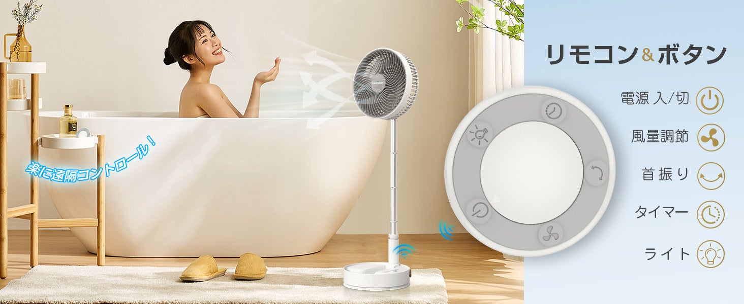 折りたたみ&伸縮自在:38cmから102cmまで自在に高さ調節が可能。コンパクトに折りたたんで収納でき、限られたスペースでも活躍します。室内はもちろん、アウトドアにも最適な多機能扇風機です。