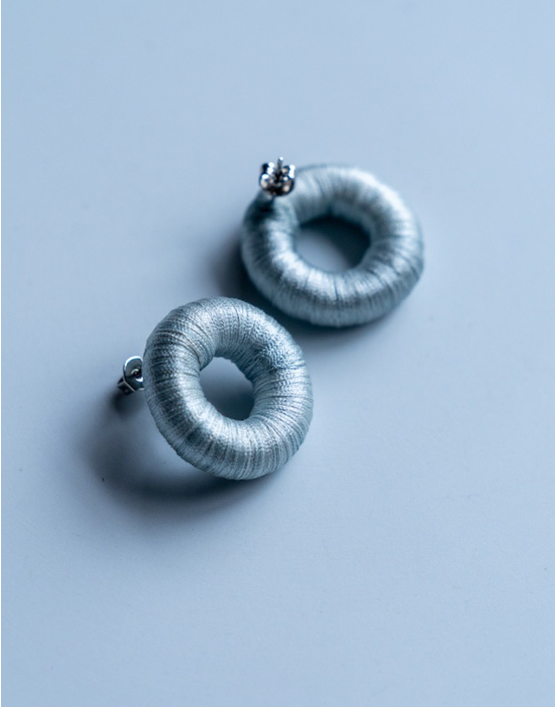 織ピアスに使用している糸は、山形県米沢市の伝統的な「米織」の機工場で出る、本来捨てられてしまうシルクの糸を使用しております。糸自体がとても美しいので、捨てるにはもったいない!そんな想いから生まれました。