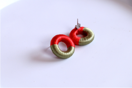 一本一本、丁寧に横糸を取り、手作業でリングに巻いています。(糸を巻く土台であるリングには、天然の木製リングを使用しており、とても軽く重さで耳が痛くなることはありません。)