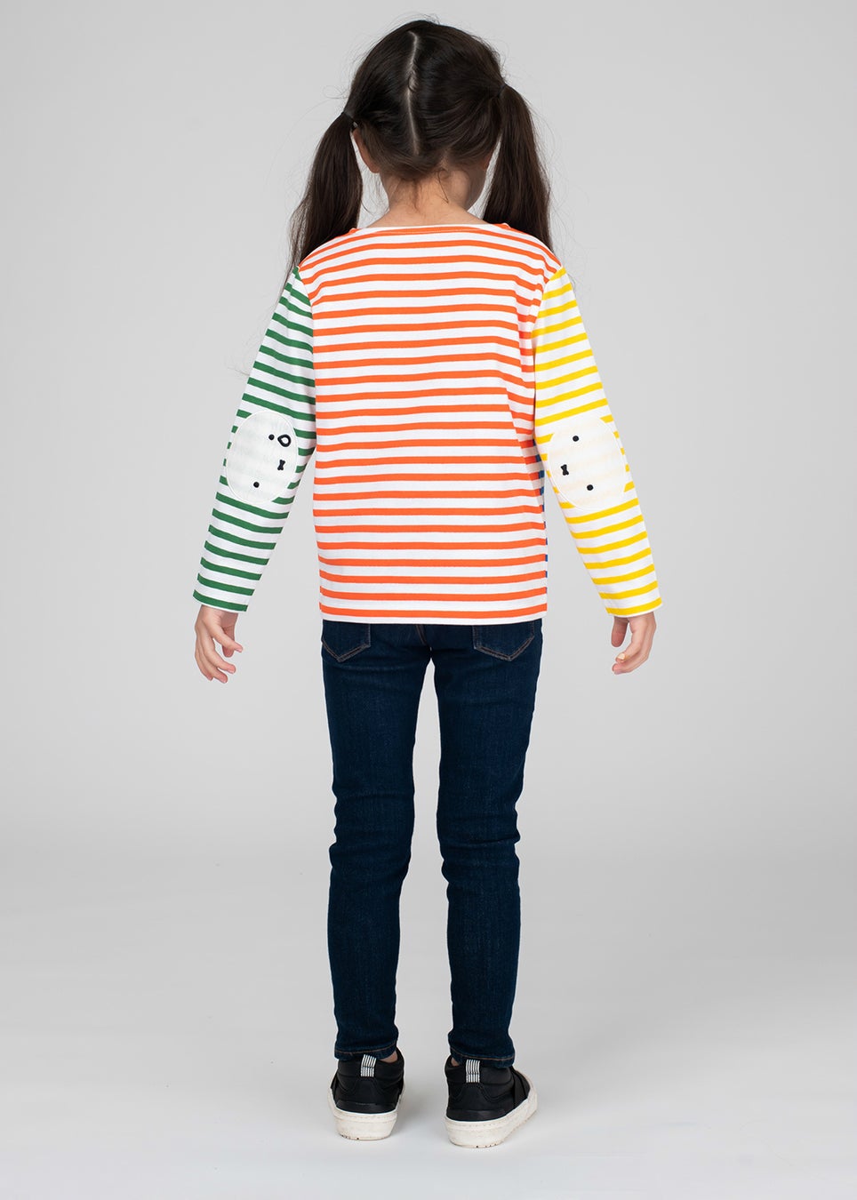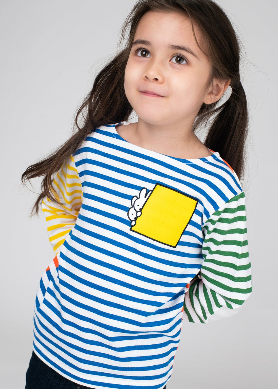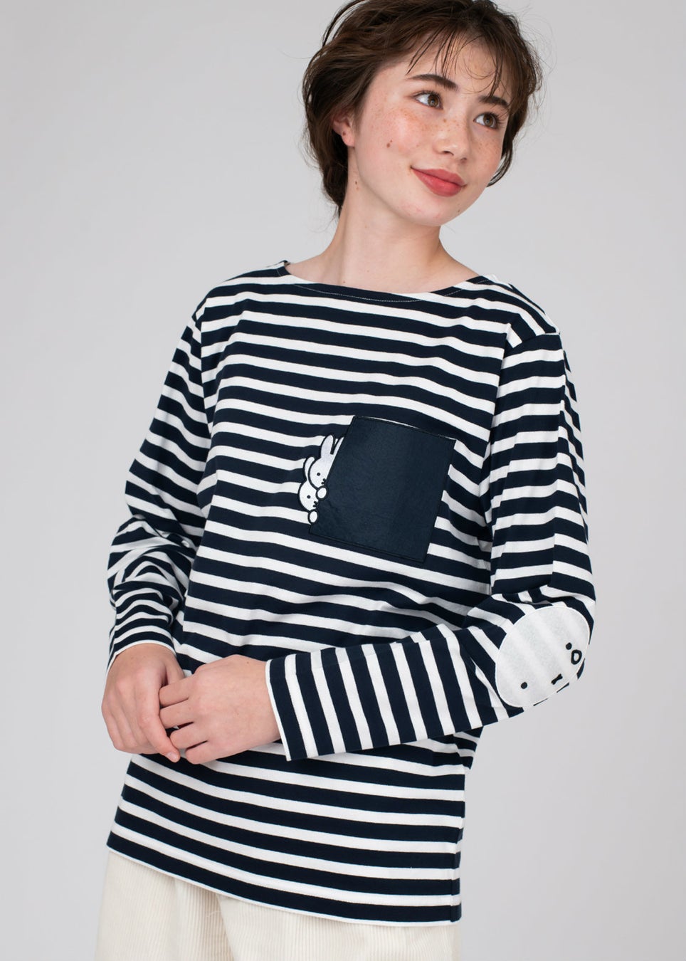 胸元のポケットからひょっこり覗いている姿が可愛い1枚です。肘にはミッフィーの顔の肘当てを付けてアクセントに。風合いの良い天竺を使用したボートネック型のボーダー長袖Tシャツ。