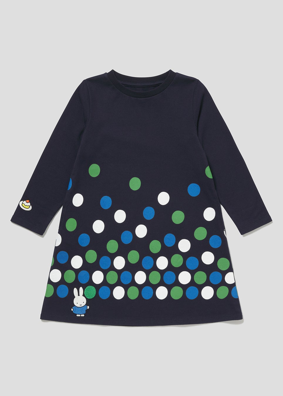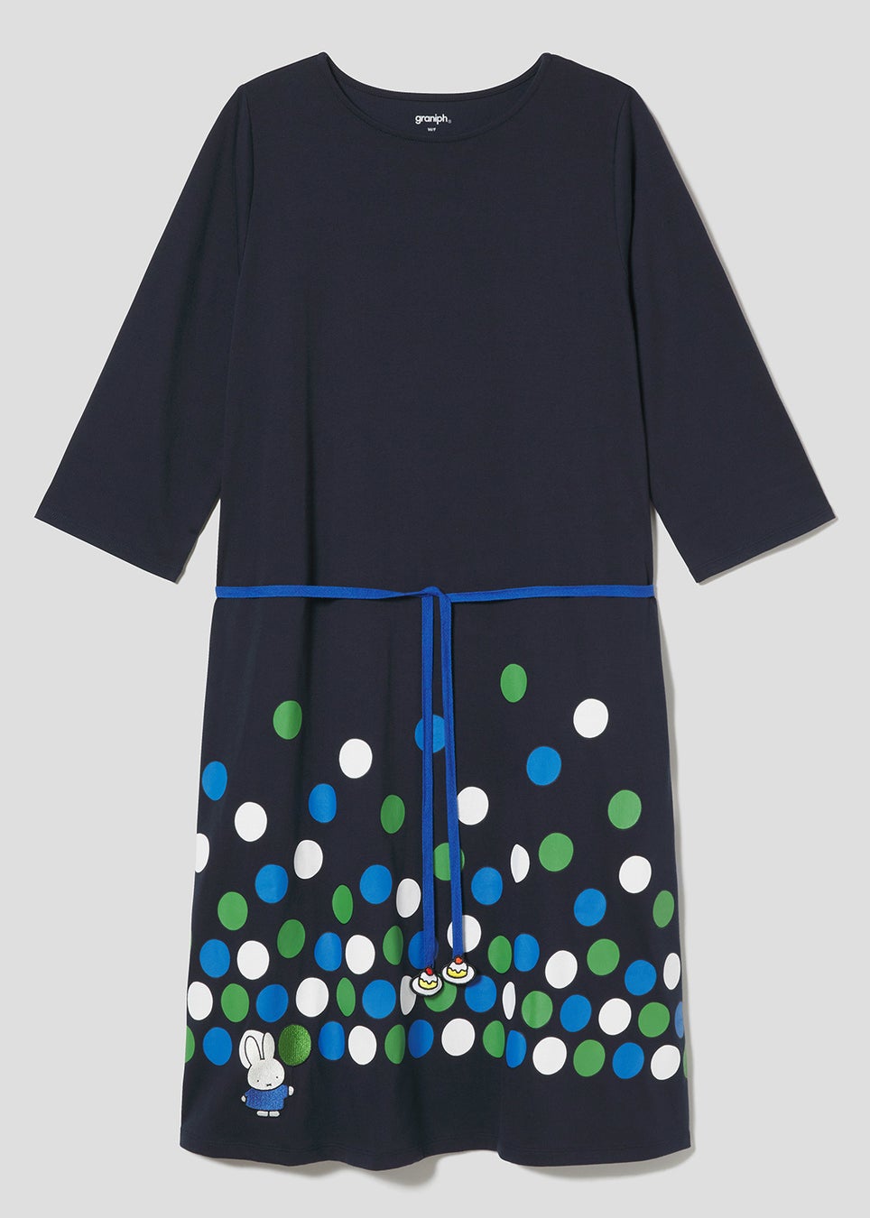 ミッフィーが持った風船がドット柄になったデザイン。ミッフィーと腰紐の先に付いたケーキは刺繍になっているなど、遊び心あるデザインです。ウエストリボン付きのAラインワンピースで両サイドにポケット付き。鎖骨部分をきれいに見せてくれるボートネックです。