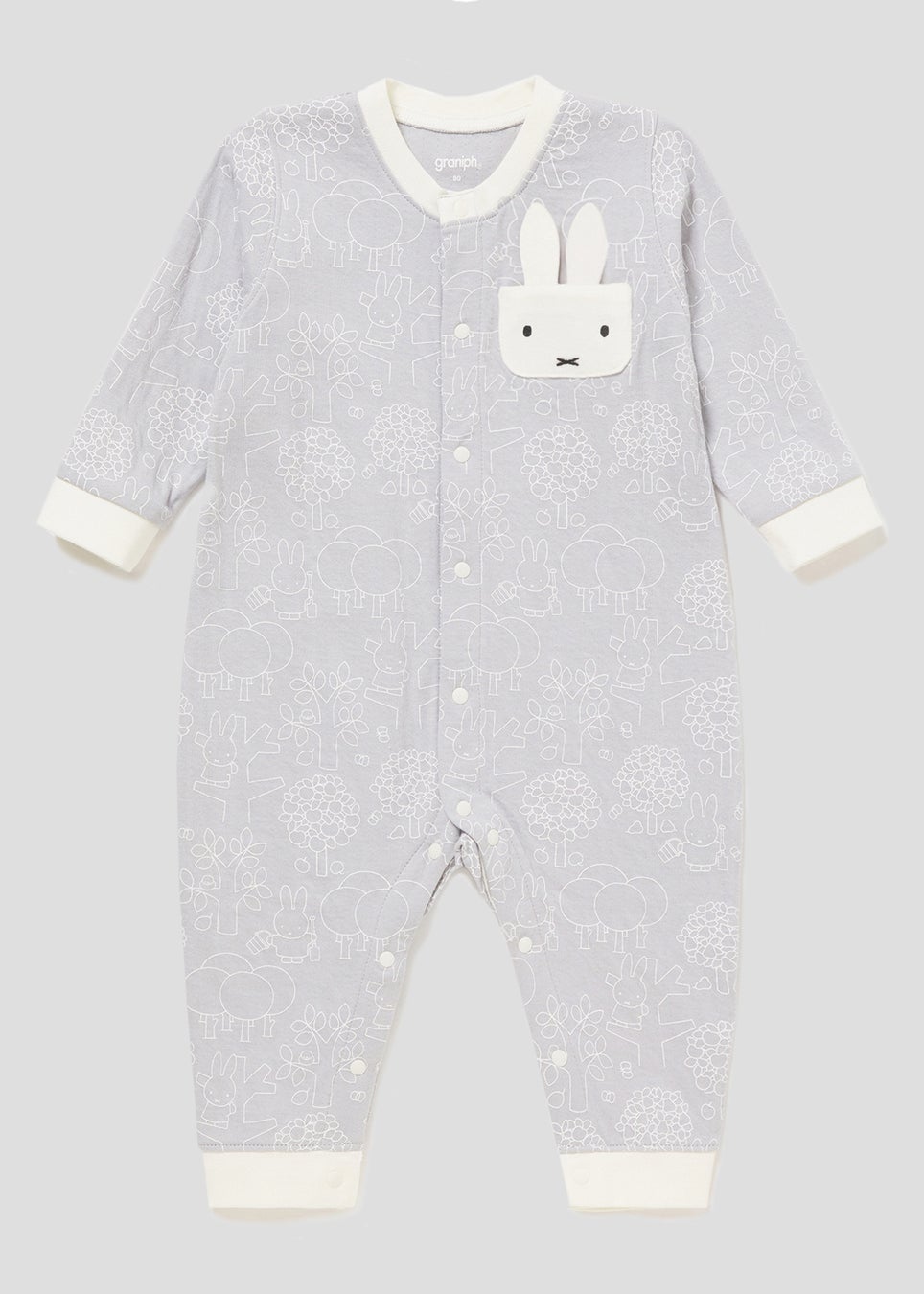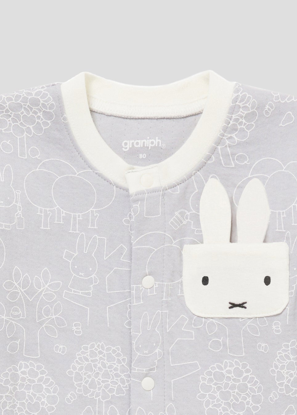 りんごの木、なしの木、鳥がとまった木など、色々な木とミッフィーを合わせたパターン柄。胸元のポケットはミッフィーの顔になっています。