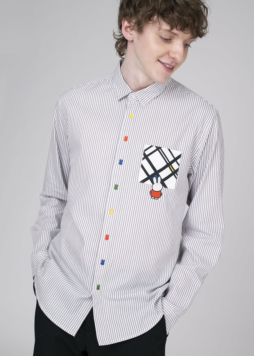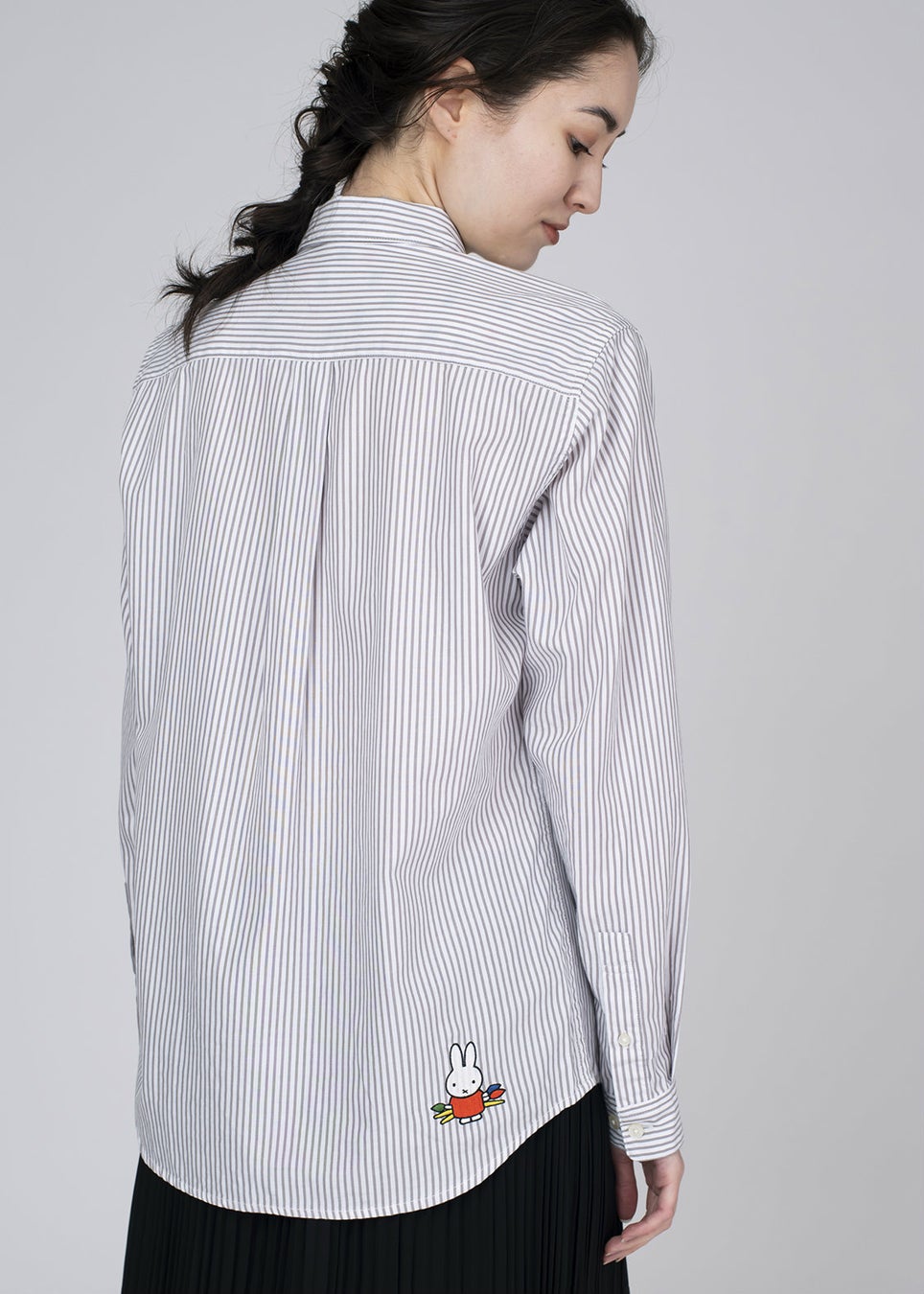 フロントのポケットは絵を眺めるミッフィー、バックの裾には筆を背中にたくさん抱えたミッフィーが刺繍されています。背当てとボタンの合わせ部分にはたくさんの美しい色のミッフィーのシルエットをデザインしました。