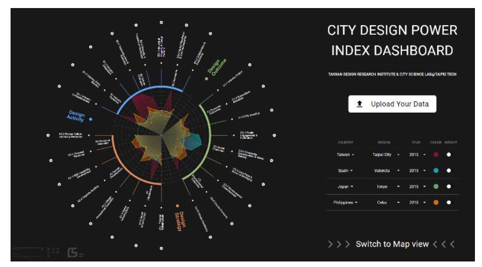 都市がどのような「デザイン力」を持っているかを測定し、デザイン力を構成する様々な要素が都市にどのようなインパクトを与えるかを分析するための指標。都市・地域課題の解決に向けて、デザインの力を可視化し政策をつくる主体や企業のみならず市民に至るまであらゆる人が都市の未来のあり方を考えられるようになることを目的としてTDRIが開発した。CDPIのモデルでは、定性・定量の両側面から各都市・地域が自らの状況や特徴を把握することができる。CDPIのダッシュボードも開発中であり、各都市におけるデザイン産業を支えるインフラの充実度、デザイン産業における経済活動の状況や社会的・経済的・環境的観点での競争力を評価する指標などが参照可能となる予定である(図1)。