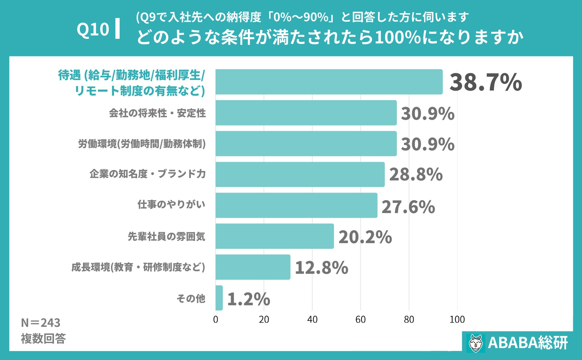 入社先への納得度が100%に達していない就活生に「どのような条件が満たされれば100%になるか」を尋ねたところ、最多は「待遇(給与・勤務地・福利厚生・リモート制度の有無など)」で38.7%でした。次いで「会社の将来性・安定性」30.9%、同率で「労働環境(労働時間/勤務体制)」30.9%が上位を占めています。