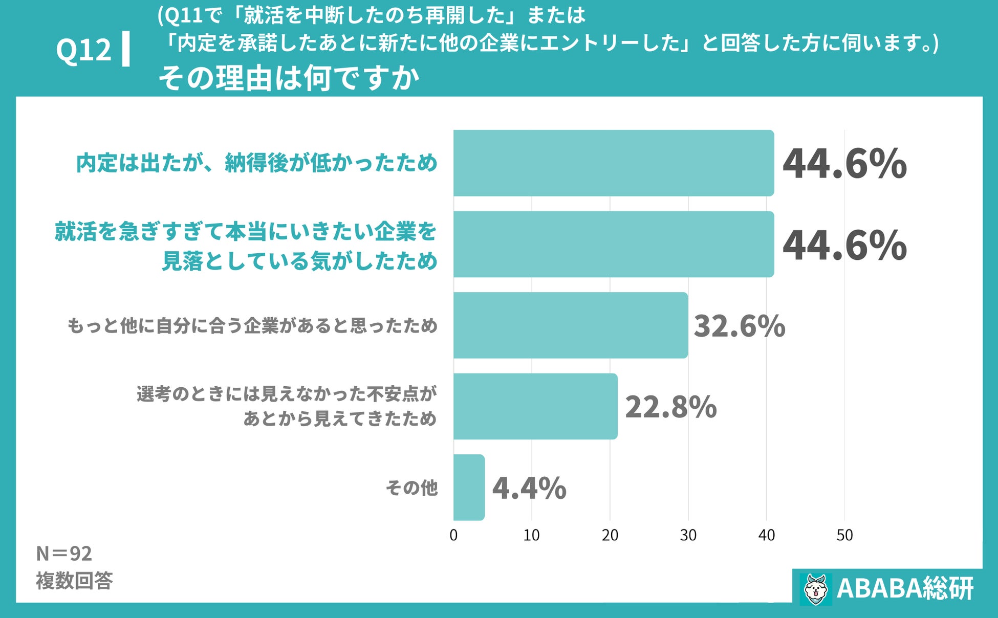 「就活を中断後に再開した」または「内定承諾後に他社へ再エントリーした」就活生に理由を尋ねたところ、最多は「内定は出たが納得度が低かったため」と、「就活を急ぎ過ぎて本当に行きたい会社を見落とした気がした」がともに44.6%で並びました。