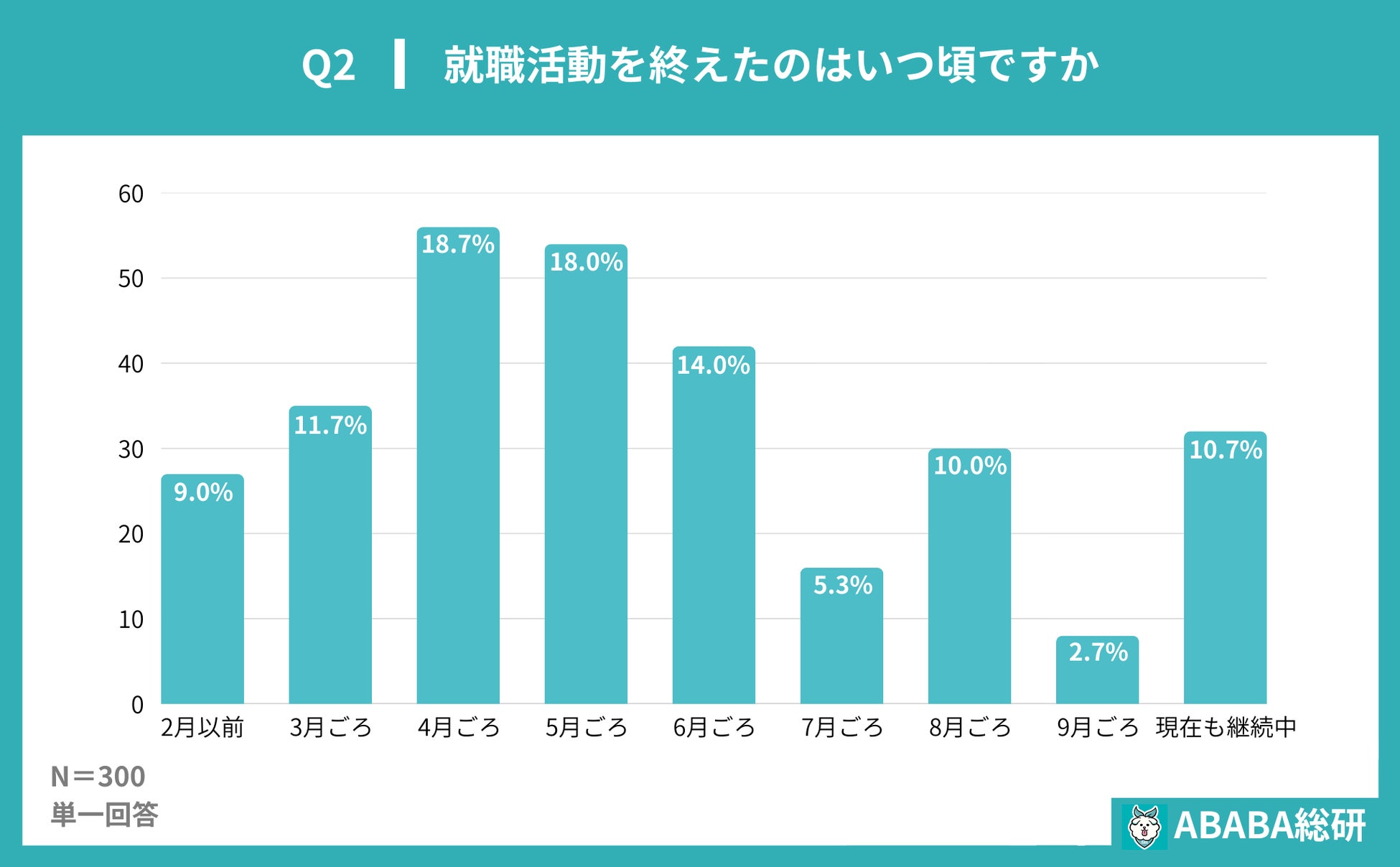 就活を終了した時期について尋ねたところ、「4月頃」という回答が18.7%と最も多く、次いで「5月頃」という回答が18.0%でした。「2月以前」から「5月頃」までに就活を終了した就活生は57.4%と過半数に達し、就活の早期化が顕著であることがわかります。