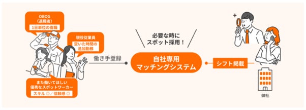 「マッチボックス」は、従来のスポットワークシステムのようにスポット求人を募集できるだけでなく、現役従業員やアルムナイ(OBOG)、一度雇用したことのある信頼できるスポットワーカーなどを独自の人材データベースに登録し、必要な時に最適な人材を自前で採用できる仕組みです。