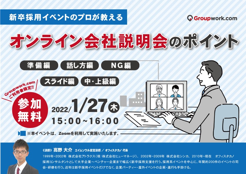 株式会社エイムソウル(本社:東京都品川区、代表取締役:稲垣隆司、以下当社)は、新卒採用や研修で活用できるグループワーク(対面・オンライン)のレンタルサービス「Groupwork.com」導入企業様限定の無料特別講習会(『オンライン会社説明会のポイント』)を実施しましたことを報告いたします。